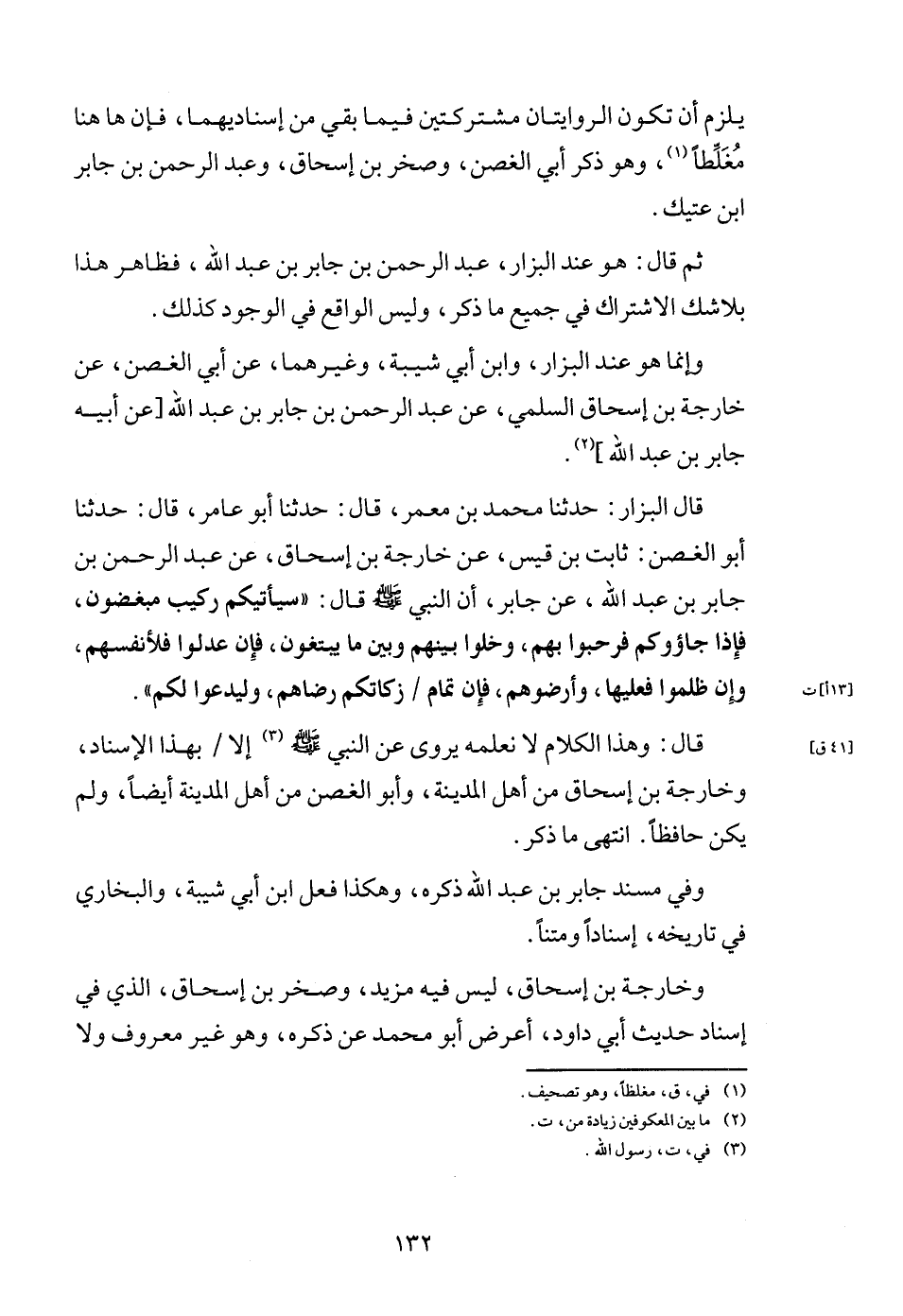 قَالَ الْبَزَّار: حَدثنَا مُحَمَّد بن معمر، قَالَ حَدثنَا أَبُو عَامر، قَالَ: حَدثنَا أَبُو الْغُصْن: ثَابت بن قيس، عَن خَارِجَة بن إِسْحَاق، عَن عبد الرَّحْمَن بن جَابر بن عبد الله، عَن جَابر، أَن النَّبِي - صَلَّى اللَّهُ عَلَيْهِ وَسَلَّم َ - قَالَ: " سَيَأْتِيكُمْ ركيب مبغضون، فَإِذا جاؤوكم فرحبوا بهم، وخلو بَينهم وَبَين مَا يَبْتَغُونَ، فَإِن عدلوا فلأنفسهم، وَإِن ظلمُوا فعلَيْهَا، وأرضوهم، فَإِن تَمام / زَكَاتكُمْ رضاهم، وليدعوا لكم ".