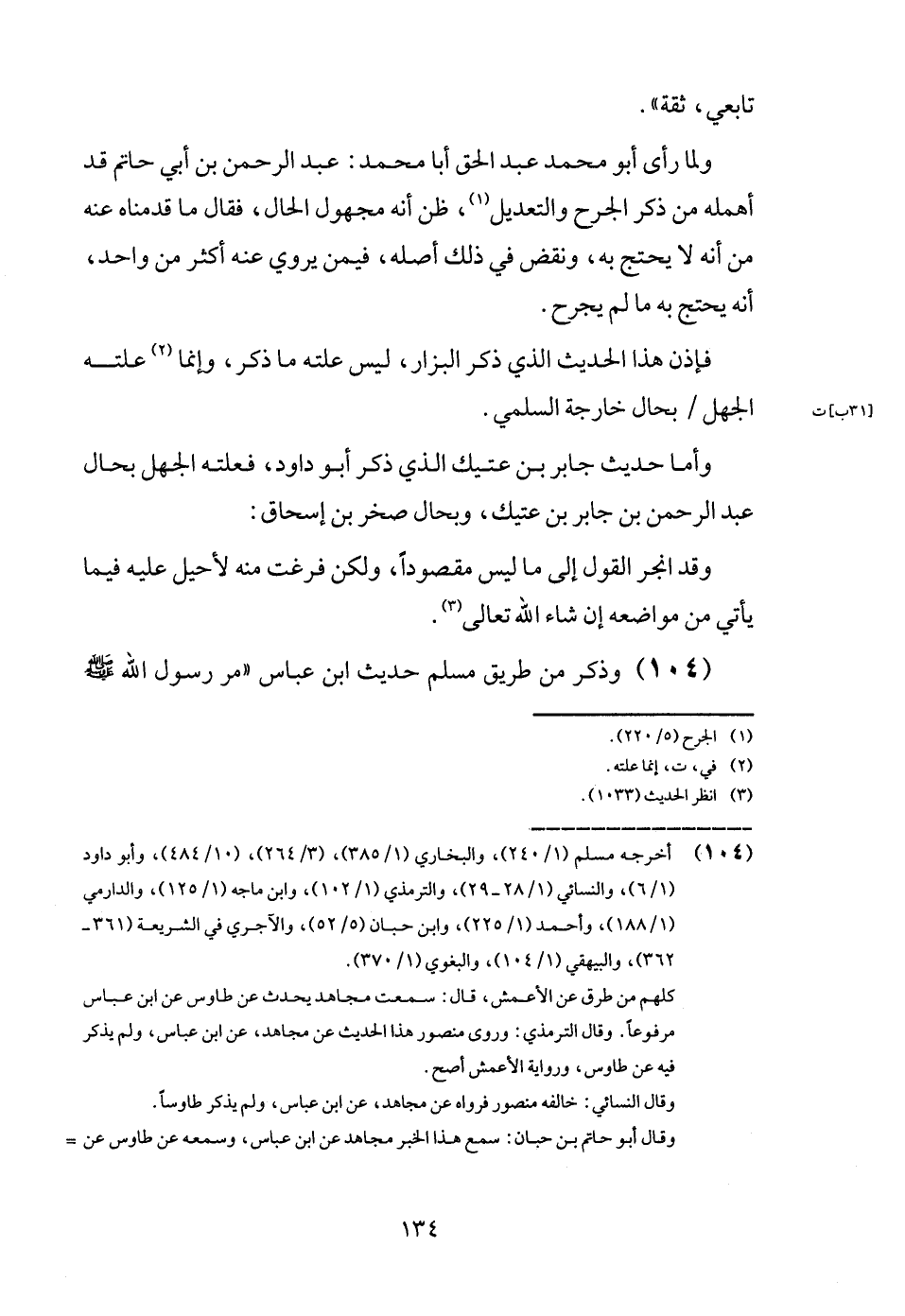 وَلما رأى أَبُو مُحَمَّد عبد الْحق أَبَا مُحَمَّد: عبد الرَّحْمَن وَأبي حَاتِم قد أهمله من ذكر الْجرْح وَالتَّعْدِيل، ظن أَنه مَجْهُول الْحَال، فَقَالَ مَا قدمْنَاهُ عَنهُ من أَنه لَا يحْتَج بِهِ، وَنقض فِي ذَلِك أَصله، فِيمَن يروي عَنهُ أَكثر من وَاحِد، أَنه يحْتَج بِهِ مَا لم يجرح.