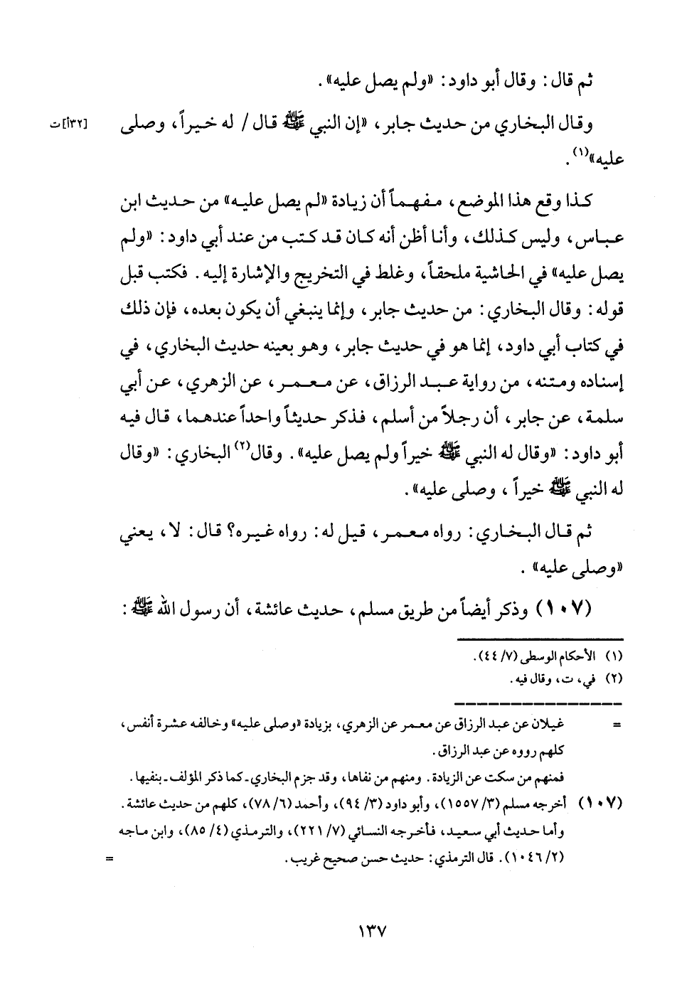 كَذَا وَقع هَذَا الْموضع، مفهماً أَن زِيَادَة " لم يصل عَلَيْهِ " من حَدِيث ابْن عَبَّاس، وَلَيْسَ كَذَلِك، وَأَنا أَظن أَنه كَانَ قد كتب من عِنْد أبي دَاوُد: " وَلم يصل عَلَيْهِ " فِي الْحَاشِيَة مُلْحقًا، وَغلط فِي التَّخْرِيج وَالْإِشَارَة إِلَيْهِ. فَكتب قبل قَوْله: وَقَالَ البُخَارِيّ: من حَدِيث جَابر، وَإِنَّمَا يَنْبَغِي أَن يكون بعده، فَإِن ذَلِك فِي كتاب أبي دَاوُد، إِنَّمَا هُوَ فِي حَدِيث جَابر، وَهُوَ بِعَيْنِه حَدِيث البُخَارِيّ، فِي إِسْنَاده وَمَتنه، من رِوَايَة عبد الرَّزَّاق، عَن معمر، عَن الزُّهْرِيّ، عَن أبي سَلمَة، عَن جَابر، أَن رجلا من أسلم، فَذكر حَدِيثا وَاحِدًا عِنْدهمَا، قَالَ فِيهِ أَبُو دَاوُد: " وَقَالَ لَهُ النَّبِي - صَلَّى اللَّهُ عَلَيْهِ وَسَلَّم َ - خيرا وَلم يصل عَلَيْهِ ". وَقَالَ البُخَارِيّ: " وَقَالَ لَهُ النَّبِي - صَلَّى اللَّهُ عَلَيْهِ وَسَلَّم َ - خيرا وَصلى عَلَيْهِ ".