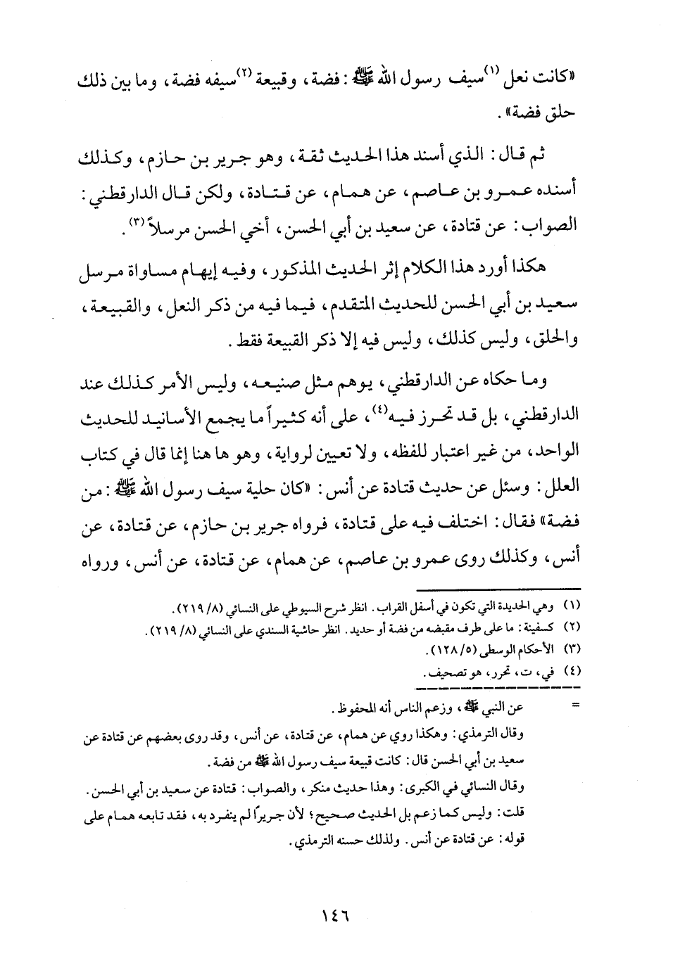 وَمَا حَكَاهُ عَن الدَّارَقُطْنِيّ، يُوهم مثل صَنِيعه، وَلَيْسَ الْأَمر كَذَلِك عِنْد الدَّارَقُطْنِيّ، بل قد تحرز فِيهِ، على أَنه كثيرا مَا يجمع الْأَسَانِيد للْحَدِيث الْوَاحِد، من غير اعْتِبَار للفظه، وَلَا تعْيين لرِوَايَة، وَهُوَ هَاهُنَا إِنَّمَا قَالَ فِي كتاب الْعِلَل: وَسُئِلَ عَن حَدِيث قَتَادَة عَن أنس: " كَانَ حلية سيف رَسُول الله - صَلَّى اللَّهُ عَلَيْهِ وَسَلَّم َ -: من فضَّة " فَقَالَ: اخْتلف فِيهِ على قَتَادَة، فَرَوَاهُ جرير بن حَازِم، عَن قَتَادَة، عَن أنس، وَكَذَلِكَ روى عَمْرو بن عَاصِم، عَن همام، عَن قَتَادَة، عَن أنس، وَرَوَاهُ
