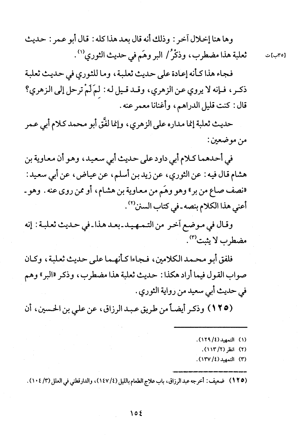 فلفق ابو مُحَمَّد الْكَلَامَيْنِ، فجاءا كَأَنَّهُمَا على حَدِيث ثَعْلَبَة، وَكَانَ صَوَاب القَوْل فِيمَا أَرَادَ هَكَذَا: حَدِيث ثَعْلَبَة هَذَا مُضْطَرب، وَذكر " الْبر " وهم فِي حَدِيث أبي سعيد من رِوَايَة الثَّوْريّ.