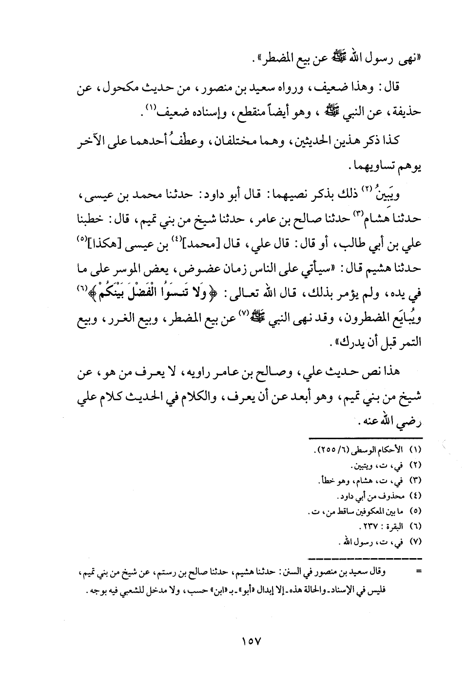 وَيبين ذَلِك بِذكر نصيهما: قَالَ أَبُو دَاوُد: حَدثنَا مُحَمَّد بن عِيسَى حَدثنَا هِشَام حَدثنَا صَالح بن عَامر، حَدثنَا شيخ من بني تَمِيم، قَالَ: خَطَبنَا عَليّ بن أبي طَالب، أَو قَالَ: قَالَ عَليّ، قَالَ [مُحَمَّد] بن عِيسَى [هَكَذَا] حَدثنَا هشيم قَالَ: " سَيَأْتِي على النَّاس زمَان عضوض، يعَض الْمُوسر على مَا فِي يَده، وَلم يُؤمر بذلك، قَالَ الله تَعَالَى: {وَلَا تنسوا الْفضل بَيْنكُم} ويبايع المضطرون، وَقد نهى النَّبِي - صَلَّى اللَّهُ عَلَيْهِ وَسَلَّم َ - عَن بيع الْمُضْطَر، وَبيع الْغرَر، وَبيع التَّمْر قبل أَن يدْرك ".