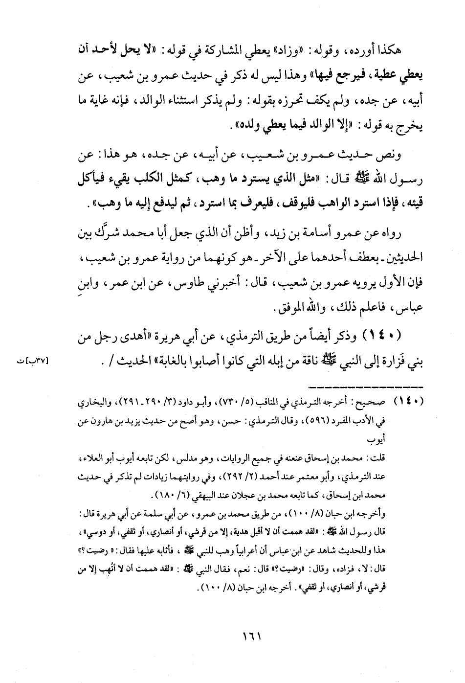 وَنَصّ حَدِيث عَمْرو بن شُعَيْب، عَن أَبِيه، عَن جده، هُوَ هَذَا: عَن رَسُول الله - صَلَّى اللَّهُ عَلَيْهِ وَسَلَّم َ - قَالَ: " مثل الَّذِي يسْتَردّ مَا وهب، كَمثل الْكَلْب يقيء فيأكل قيئه، فَإِذا اسْتردَّ الْوَاهِب فليوقف، فليعرف بِمَا اسْتردَّ، ثمَّ ليدفع إِلَيْهِ مَا وهب ".