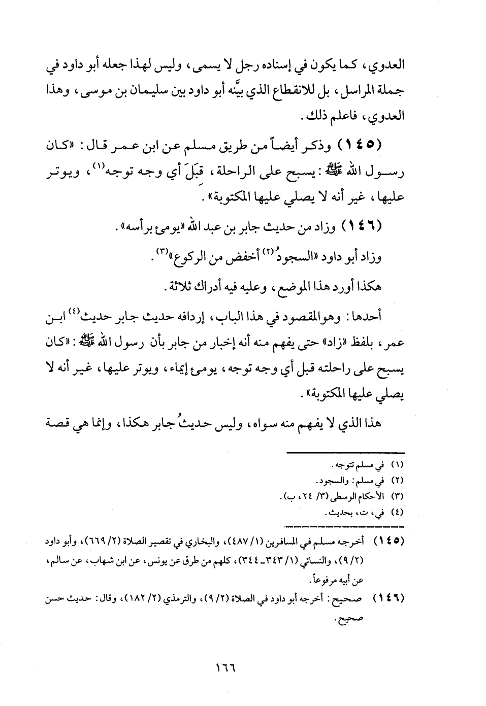 (145) وَذكر أَيْضا من طَرِيق مُسلم عَن ابْن عمر قَالَ: " كَانَ رَسُول الله - صَلَّى اللَّهُ عَلَيْهِ وَسَلَّم َ -: يسبح على الرَّاحِلَة، قبل أَي وَجه توجه، ويوتر عَلَيْهَا، غير أَنه لَا يُصَلِّي عَلَيْهَا الْمَكْتُوبَة ".