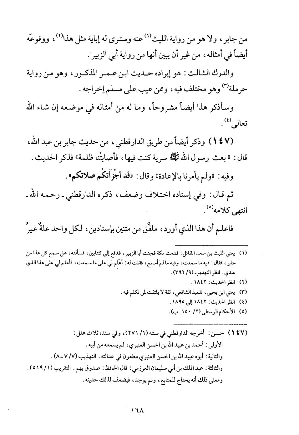 (147) وَذكر أَيْضا من طَرِيق الدَّارَقُطْنِيّ، من حَدِيث جَابر بن عبد الله، قَالَ: " بعث رَسُول الله - صَلَّى اللَّهُ عَلَيْهِ وَسَلَّم َ - سَرِيَّة كنت فِيهَا، فأصابتنا ظلمَة " فَذكر الحَدِيث.