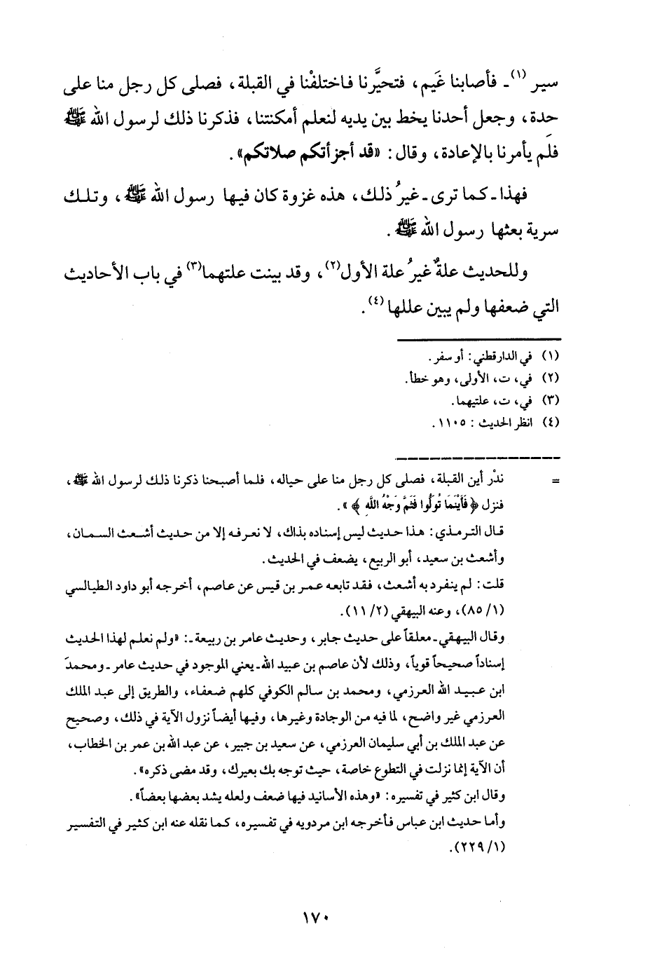 سير - فأصابنا غيم، فتحيرنا فاختلفنا فِي الْقبْلَة، فصلى كل رجل منا على حِدة، وَجعل أَحَدنَا يخط بَين يَدَيْهِ لنعلم أمكنتنا، فَذَكرنَا ذَلِك لرَسُول الله - صَلَّى اللَّهُ عَلَيْهِ وَسَلَّم َ - فَلم يَأْمُرنَا بِالْإِعَادَةِ، وَقَالَ: قد أجزأتكم صَلَاتكُمْ ".
