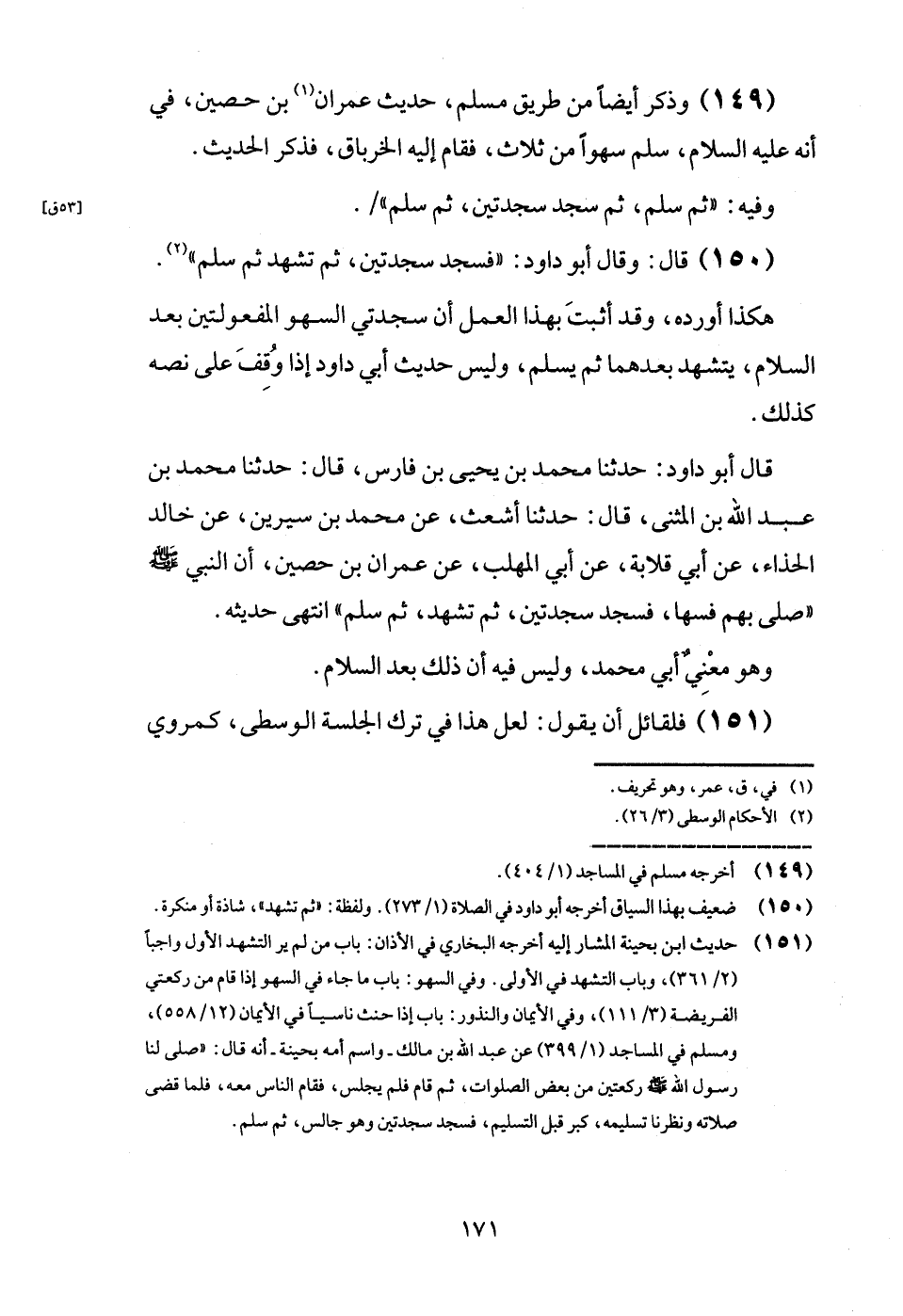 (149) وَذكر أَيْضا من طَرِيق مُسلم، حَدِيث عمرَان بن حُصَيْن، فِي أَنه عَلَيْهِ السَّلَام، سلم سَهوا من ثَلَاث، فَقَامَ إِلَيْهِ الْخِرْبَاق، فَذكر الحَدِيث.