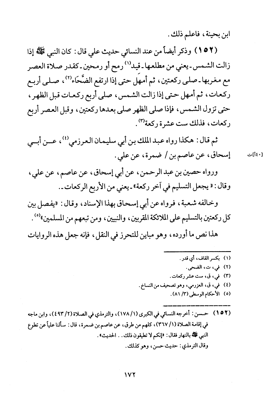 (152) وَذكر أَيْضا من عِنْد النَّسَائِيّ حَدِيث عَليّ قَالَ: كَانَ النَّبِي - صَلَّى اللَّهُ عَلَيْهِ وَسَلَّم َ - إِذا زَالَت الشَّمْس - يَعْنِي من مطْلعهَا - قيد رمح أَو رُمْحَيْنِ - كَقدْر صَلَاة الْعَصْر مَعَ مغْرِبهَا - صلى رَكْعَتَيْنِ، ثمَّ أمْهل حَتَّى إِذا ارْتَفع الضحاء، صلى أَربع رَكْعَات، ثمَّ أمْهل حَتَّى إِذا زَالَت الشَّمْس، صلى أَربع رَكْعَات قبل الظّهْر حَتَّى تَزُول الشَّمْس، فَإِذا صلى الظّهْر صلى بعْدهَا رَكْعَتَيْنِ، وَقبل الْعَصْر أَربع رَكْعَات، فَذَلِك سِتّ عشرَة رَكْعَة.