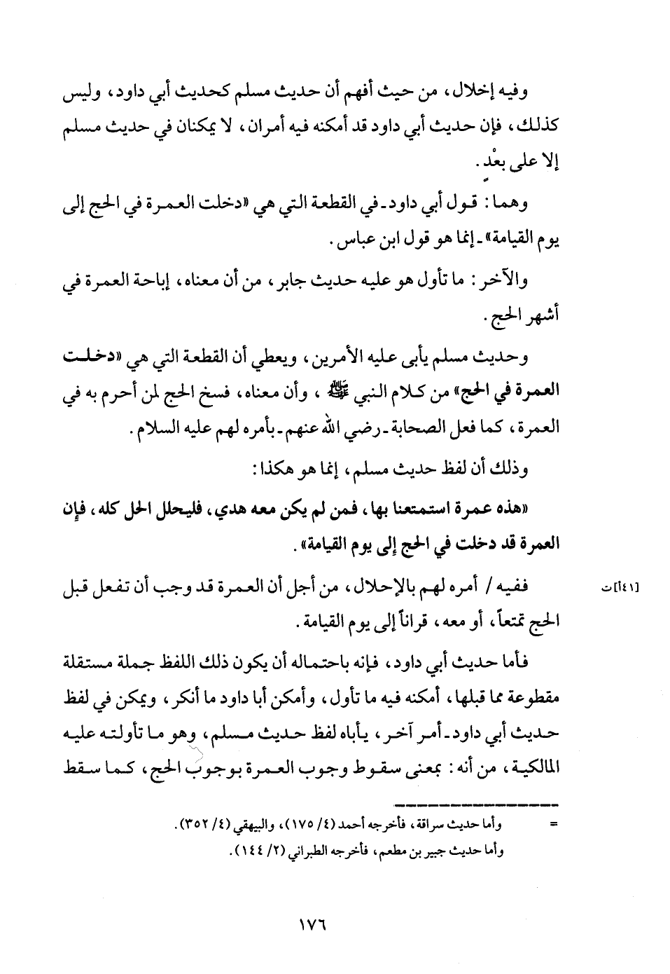 فَأَما حَدِيث أبي دَاوُد، فَإِنَّهُ باحتماله أَن يكون ذَلِك اللَّفْظ جملَة مُسْتَقلَّة مَقْطُوعَة مِمَّا قبلهَا، أمكنه فِيهِ مَا تَأَول، وَأمكن أَبَا دَاوُد مَا أنكر، وَيُمكن فِي لفظ حَدِيث أبي دَاوُد - أَمر آخر، يأباه لفظ حَدِيث مُسلم، وَهُوَ مَا تأولته عَلَيْهِ الْمَالِكِيَّة، من أَنه: بِمَعْنى سُقُوط وجوب الْعمرَة بِوُجُوب الْحَج، كَمَا سقط.