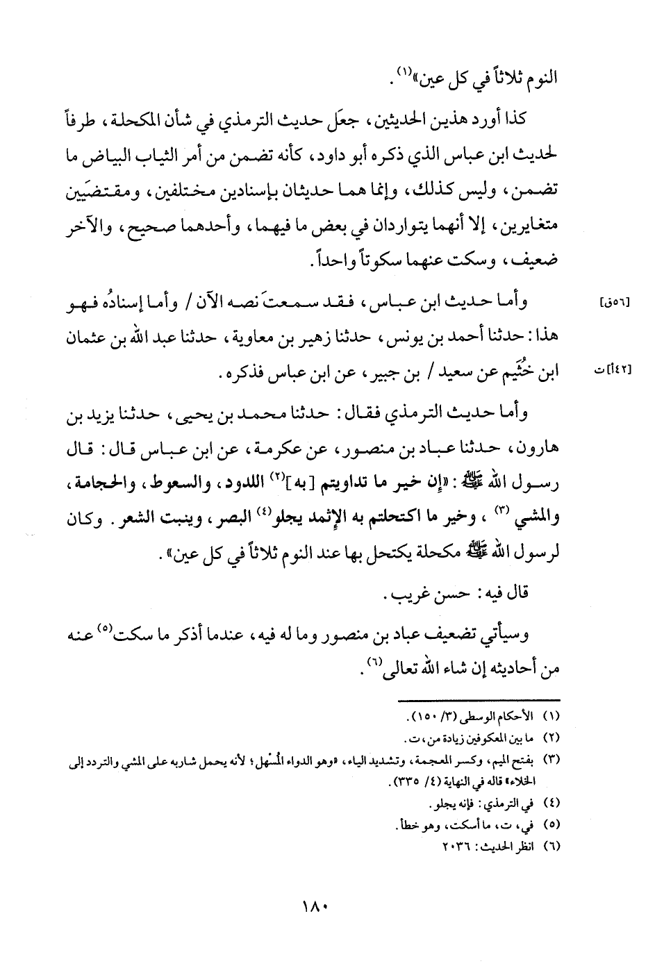 وَأما حَدِيث التِّرْمِذِيّ فَقَالَ: حَدثنَا مُحَمَّد بن يحيى، حَدثنَا يزِيد بن هَارُون، حَدثنَا عباد بن مَنْصُور، عَن عِكْرِمَة، عَن ابْن عَبَّاس قَالَ: قَالَ رَسُول الله - صَلَّى اللَّهُ عَلَيْهِ وَسَلَّم َ -: " إِن خير مَا تداويتم [بِهِ] اللدود، والسعوط، والحجامة، وَالْمَشْي، وَخير مَا اكتحلتم بِهِ الإثمد يجلو الْبَصَر، وينبت الشّعْر. وَكَانَ لرَسُول الله - صَلَّى اللَّهُ عَلَيْهِ وَسَلَّم َ - مكحلة يكتحل بهَا عِنْد النّوم ثَلَاثًا فِي كل عين ".