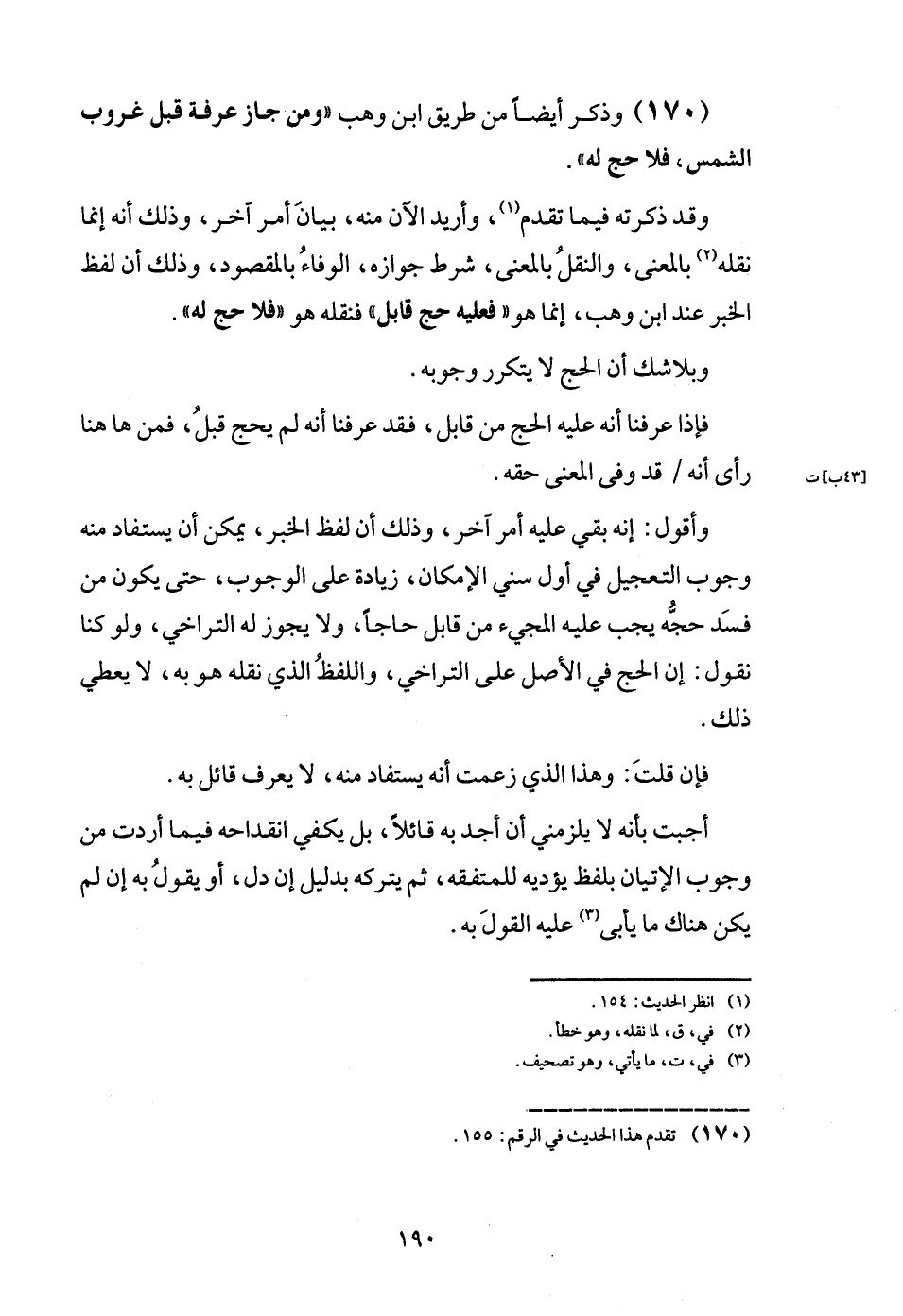 وَقد ذكر ته فِيمَا تقدم، وَأُرِيد الْآن مِنْهُ، بَيَان أَمر آخر، وَذَلِكَ أَنه إِنَّمَا نَقله بِالْمَعْنَى، وَالنَّقْل بِالْمَعْنَى، شَرط جَوَازه، الْوَفَاء بِالْمَقْصُودِ، ذَلِك أَن لفظ الْخَبَر عِنْد ابْن وهب، إِنَّمَا هُوَ ": فَعَلَيهِ حج قَابل: فنقله هُوَ " فَلَا حج لَهُ ".