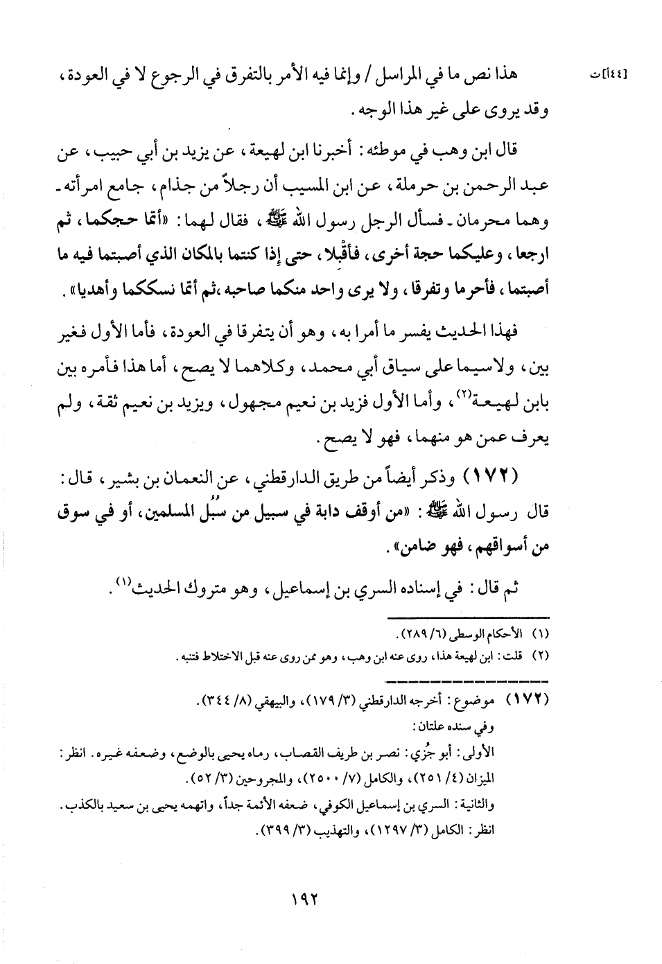فَهَذَا الحَدِيث يُفَسر مَا أمرا بِهِ، وَهُوَ أَن يَتَفَرَّقَا فِي العودة، فَأَما الأول فَغير بَين، وَلَا سِيمَا على سِيَاق ابي مُحَمَّد، وَكِلَاهُمَا لَا يَصح، وَأما هَذَا فَأمره بَين بِابْن لَهِيعَة، وَأما الأول فزيد بن نعيم مَجْهُول، وَيزِيد بن نعيم ثِقَة، وَلم يعرف عَمَّن هُوَ مِنْهُمَا، فَهُوَ لَا يَصح.