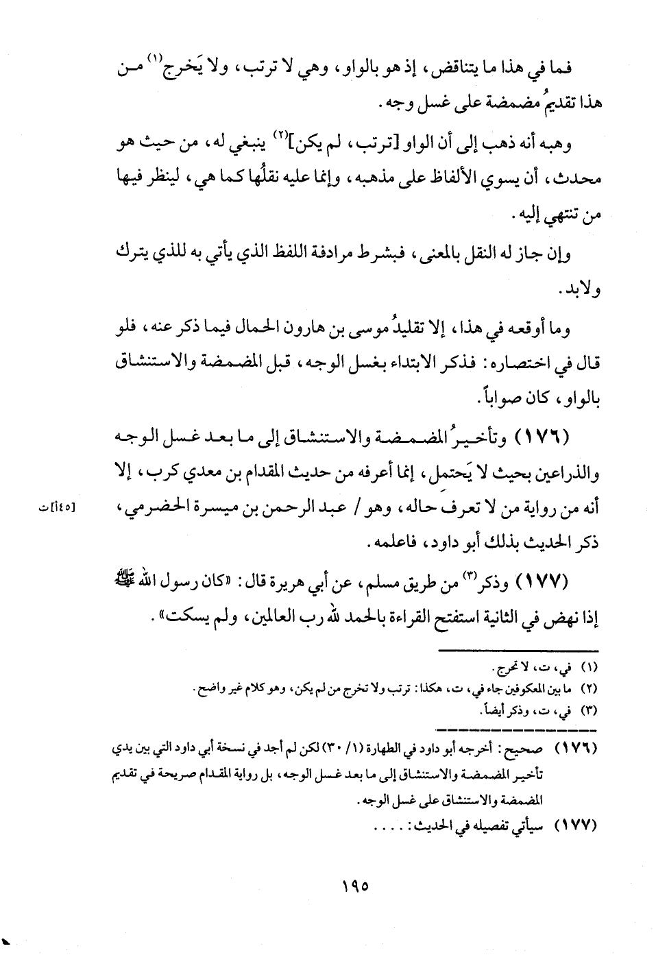 (176) وَتَأْخِير الْمَضْمَضَة وَالِاسْتِنْشَاق إِلَى مَا بعد غسل الْوَجْه والذراعين بِحَيْثُ لَا يحْتَمل، إِنَّمَا أعرفهُ من حَدِيث الْمِقْدَام بن معدي كرب، إِلَّا أَنه من رِوَايَة من لَا تعرف حَاله، وَهُوَ / عبد الرَّحْمَن بن ميسرَة الْحَضْرَمِيّ، ذكر الحَدِيث بذلك أَبُو دَاوُد، فاعلمه.