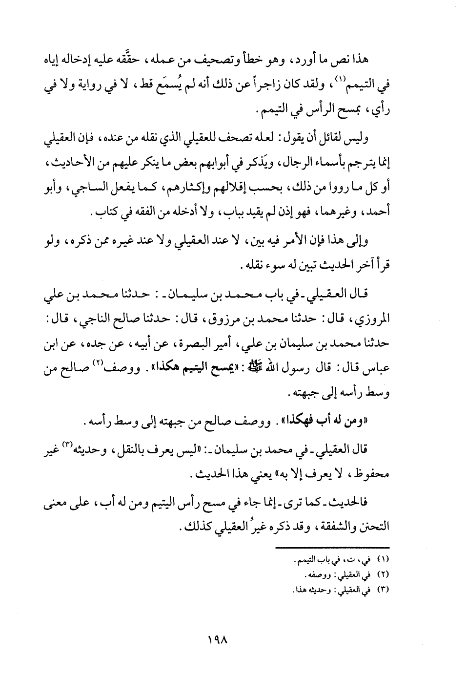 قَالَ الْعقيلِيّ - فِي بَاب مُحَمَّد بن سُلَيْمَان -: حَدثنَا مُحَمَّد بن عَليّ الْمروزِي، قَالَ: حَدثنَا مُحَمَّد بن مَرْزُوق، قَالَ: حَدثنَا صَالح النَّاجِي، قَالَ: حَدثنَا مُحَمَّد بن سُلَيْمَان بن عَليّ، أَمِير الْبَصْرَة، عَن أَبِيه، عَن جده، عَن ابْن عَبَّاس قَالَ: قَالَ رَسُول الله - صَلَّى اللَّهُ عَلَيْهِ وَسَلَّم َ -: " يمسح الْيَتِيم هَكَذَا ". وَوصف صَالح من وسط رٍأسه إِلَى جَبهته.