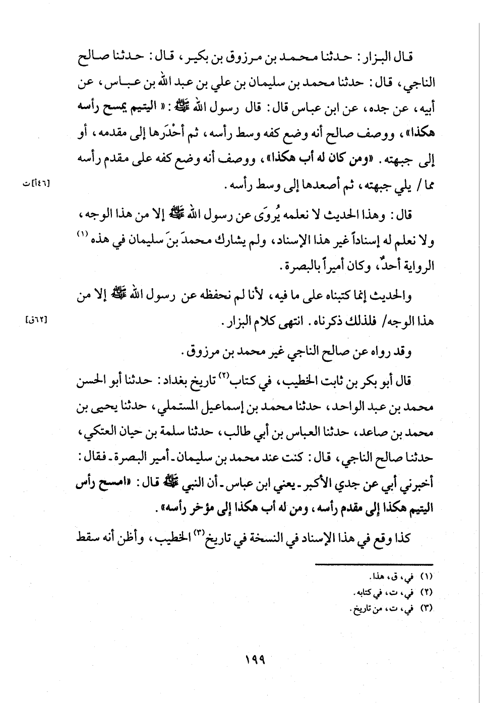 قَالَ الْبَزَّار: حَدثنَا مُحَمَّد بن مَرْزُوق بن بكير، قَالَ حَدثنَا صَالح النَّاجِي، قَالَ: حَدثنَا مُحَمَّد بن سُلَيْمَان بن عَليّ بن عبد الله بن عَبَّاس، عَن أَبِيه، عَن جده، عَن ابْن عَبَّاس قَالَ: قَالَ رَسُول الله - صَلَّى اللَّهُ عَلَيْهِ وَسَلَّم َ -: " الْيَتِيم يمسح رَأسه هَكَذَا "، وَوصف صَالح أَنه وضع كَفه وسط رَأسه، ثمَّ أحدرها إِلَى مقدمه، أَو إِلَى جَبهته. " وَمن كن لَهُ أَب هَكَذَا "، وَوصف أَنه وضع كَفه على مقدم رَأسه مِمَّا / يَلِي جَبهته، ثمَّ اصعدها إِلَى وسط رٍأه.