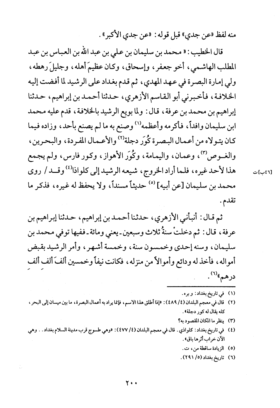 قَالَ الْخَطِيب: " مُحَمَّد بن سُلَيْمَان بن عَليّ بن عبد الله بن الْعَبَّاس بن عبد الْمطلب الْهَاشِمِي، أَخُو جَعْفَر، وَإِسْحَاق، وَكَانَ عَظِيم أَهله، وجليل رهطه، ولي إِمَارَة الْبَصْرَة فِي عهد الْمهْدي، ثمَّ قدم بَغْدَاد على الرشيد لما أفضت إِلَيْهِ الهلافة، فَأَخْبرنِي أَبُو الْقَاسِم الْأَزْهَرِي، حَدثنَا أَحْمد بن إِبْرَاهِيم، حَدثنَا إِبْرَاهِيم بن مُحَمَّد بن عَرَفَة، قَالَ: وَلما بُويِعَ الرشيد بالخلافة، قدم عَلَيْهِ مُحَمَّد ابْن سُلَيْمَان وافداً، فَأكْرمه وأعظمه وصنع بِهِ مَا لم يصنع بِأحد وزاده فِيمَا كَانَ يَتَوَلَّاهُ من أَعمال الْبَصْرَة كور دجلة والأعمال المفردة، والبحرين، والغوص، وعمان، واليمامة، وكور الأهواز، وكور فَارس، وَلم يجمع هَذَا لأحد غَيره، فَلَمَّا أَرَادَ الْخُرُوج، شيعه الرشيد إِلَى كلواذا وَقد / روى مُحَمَّد بن سُلَيْمَان [عَن أَبِيه] حَدثنَا مُسْندًا، وَلَا يحفظ لَهُ غَيره، فَذكر مَا تقدم.