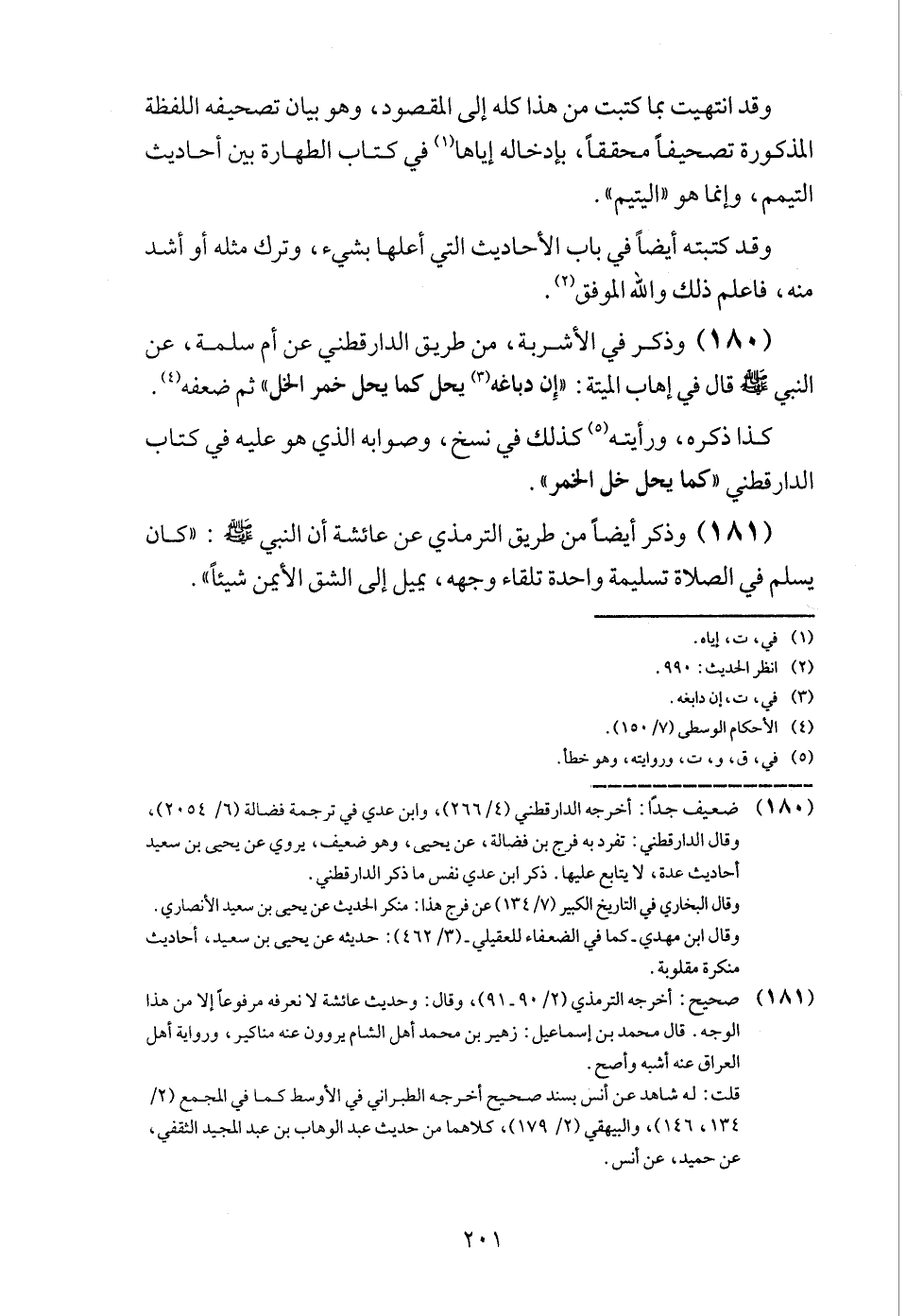 (180) وَذكر فِي الْأَشْرِبَة، من طَرِيق الدَّارَقُطْنِيّ عَن أم سَلمَة، عَن النَّبِي - صَلَّى اللَّهُ عَلَيْهِ وَسَلَّم َ - قَالَ فِي إهَاب الْميتَة: " إِن دباغه يحل كَمَا يحل خمر الْخلّ " ثمَّ ضعفه.