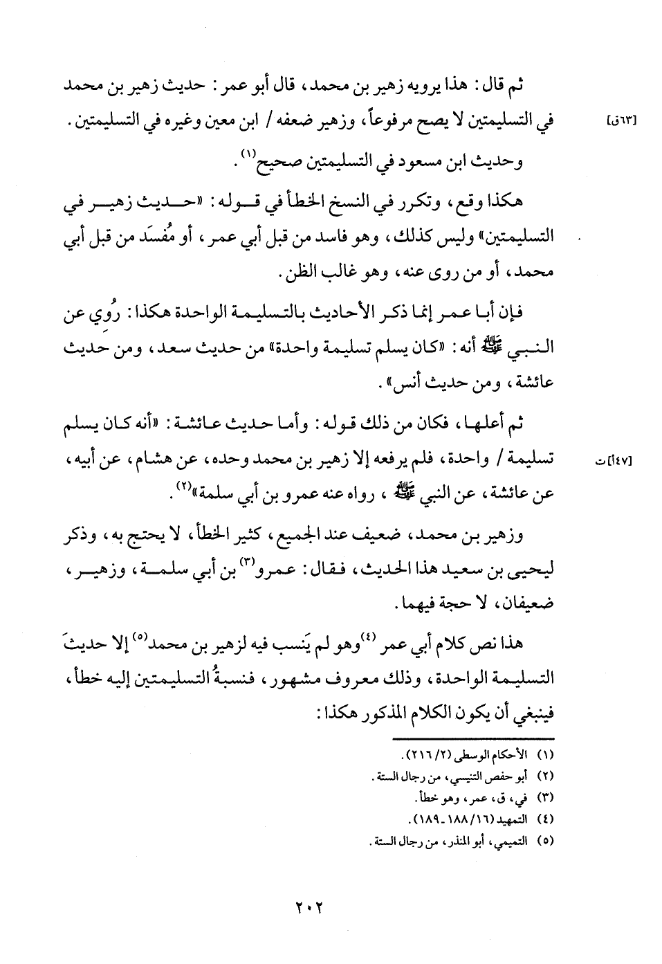 هَذَا نَص كَلَام أبي عمر وَهُوَ لم ينْسب فِيهِ لزهير بن مُحَمَّد إِلَّا حَدِيث التسليمة الْوَاحِدَة، وَذَلِكَ مَعْرُوف مَشْهُور، فنسبة التسليمتين إِلَيْهِ خطأ فَيَنْبَغِي أَن يكون الْكَلَام الْمَذْكُور هَكَذَا: