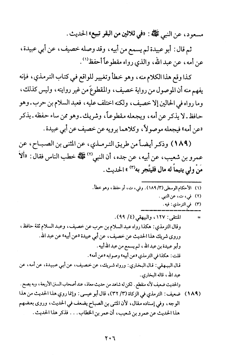 كَذَا وَقع هَذَا الْكَلَام مِنْهُ، وَهُوَ خطأ وتغيير للْوَاقِع فِي كتاب التِّرْمِذِيّ، فَإِنَّهُ يفهم مِنْهُ أَن الْمَوْصُول من رِوَايَة خصيف، والمقطوع من غير رِوَايَته، وَلَيْسَ كَذَلِك، وَمَا رَوَاهُ فِي الْحَالين إِلَّا خصيف، وَلكنه اخْتلف عَلَيْهِ، فعبد السَّلَام بن حَرْب - وَهُوَ حَافظ - لَا يذكر عَن أمه ويجعله مَقْطُوعًا، وَشريك - وَهُوَ مِمَّن سَاءَ حفظه - يذكر " عَن أمه فَيَجْعَلهُ مَوْصُولا، وَكِلَاهُمَا يرويهِ عَن خصيف عَن أبي عُبَيْدَة.