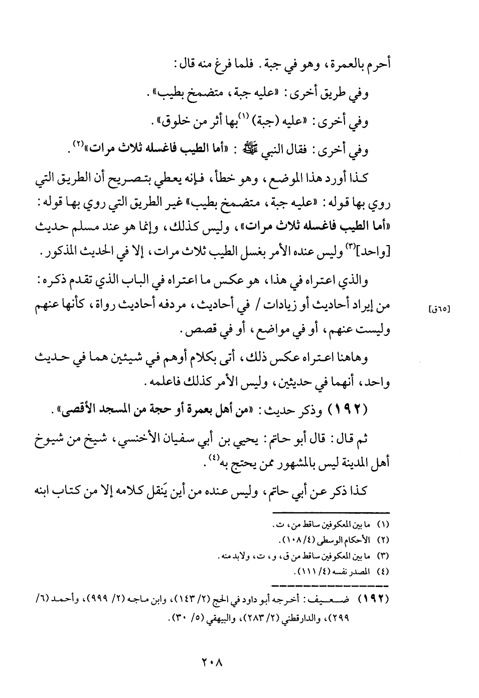 كَذَا أورد هَذَا الْموضع، وَهُوَ خطأ، فَإِنَّهُ يُعْطي بتصريح أَن الطَّرِيق الَّتِي روى بهَا قَوْله: " عَلَيْهِ جُبَّة، متضمخ بِطيب " غير الطَّرِيق الَّتِي رُوِيَ بهَا قَوْله: " أما الطّيب فاغسله ثَلَاث مَرَّات "، وَلَيْسَ كَذَلِك، وَإِنَّمَا هُوَ عِنْد مُسلم حَدِيث [وَاحِد] وَلَيْسَ عِنْده الْأَمر بِغسْل الطّيب ثَلَاث مَرَّات، إِلَّا فِي الحَدِيث الْمَذْكُور.