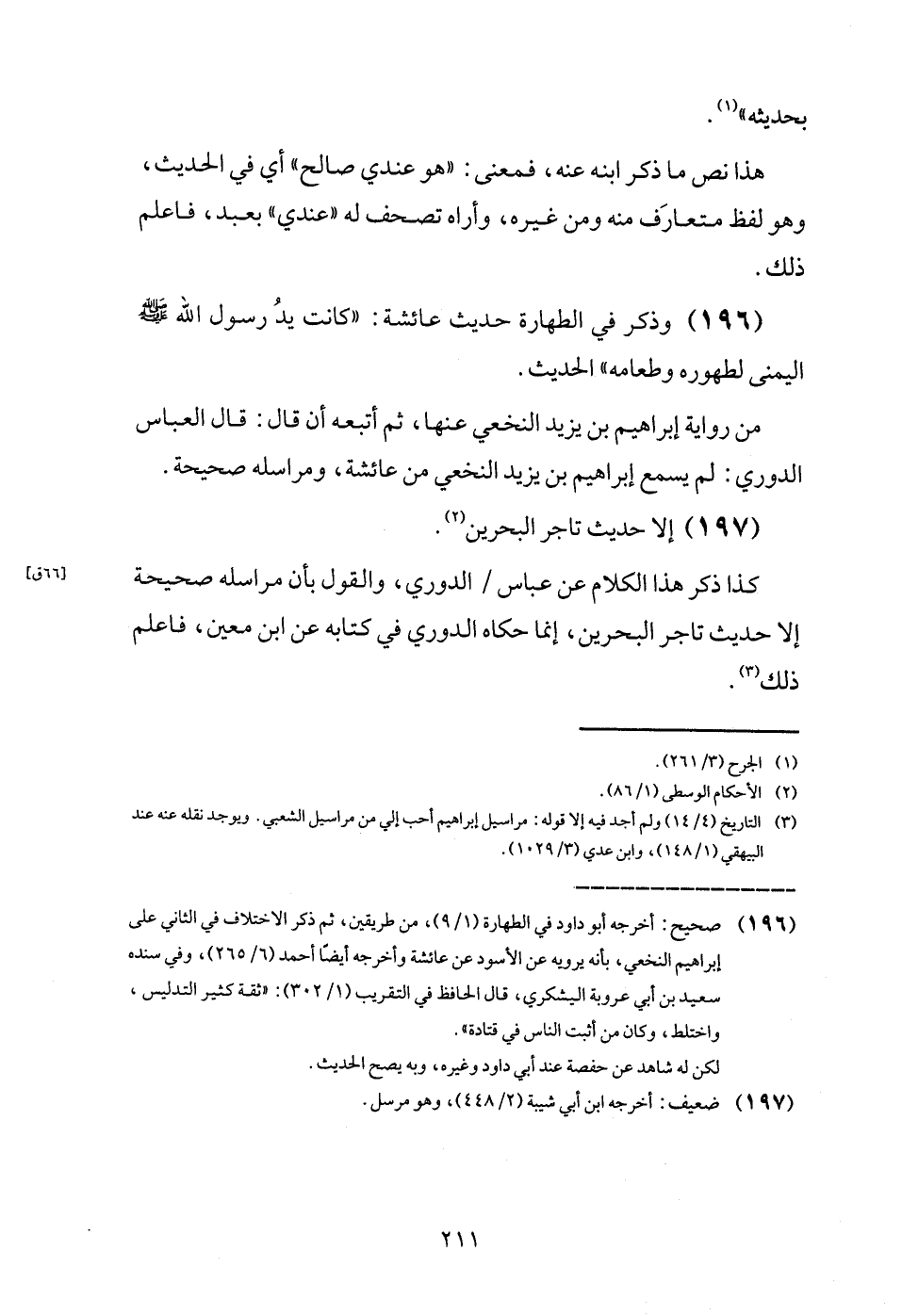 من رِوَايَة إِبْرَاهِيم بن يزِيد النَّخعِيّ عَنْهَا، ثمَّ أتبعه أَن قَالَ: قَالَ الْعَبَّاس الدوري: لم يسمع إِبْرَاهِيم بن يزِيد النَّخعِيّ من عَائِشَة، ومراسله صَحِيحَة.