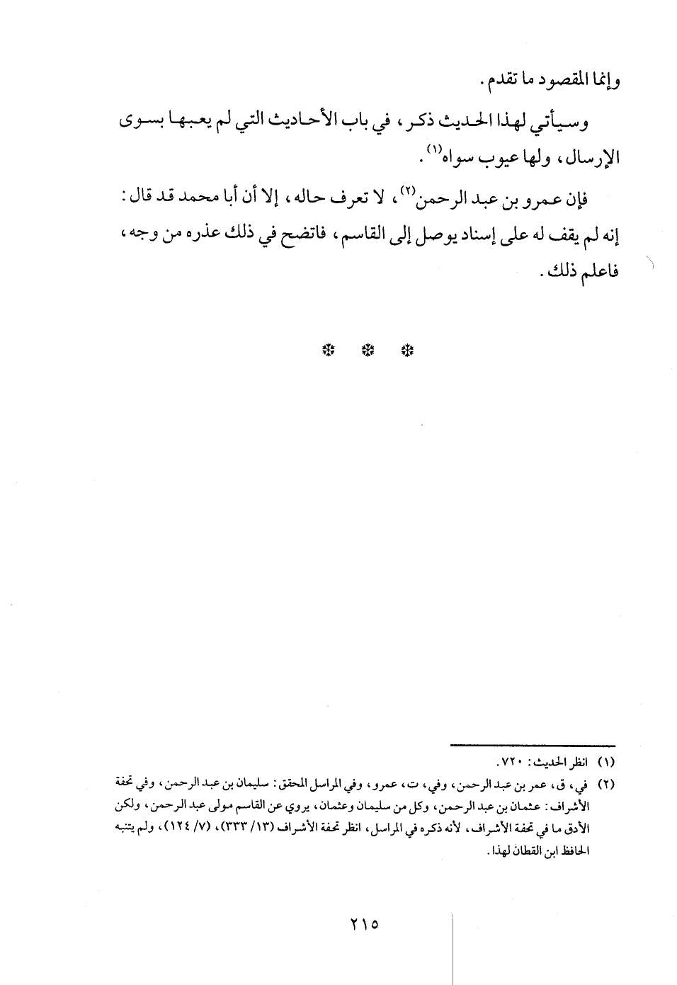 فَإِن عَمْرو بن عبد الرَّحْمَن، لَا تعرف حَاله، إِلَّا أَن أَبَا مُحَمَّد قد قَالَ: إِنَّه لم يقف لَهُ على إِسْنَاد يُوصل إِلَى الْقَاسِم، فاتضح فِي ذَلِك عذره من وَجه، فَاعْلَم ذَلِك.