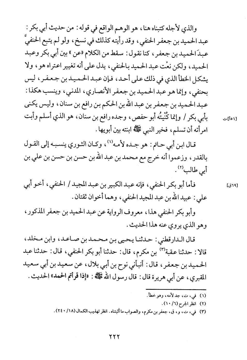وَالَّذِي لأَجله كتبناه هُنَا، هُوَ الْوَهم الْوَاقِع فِي قَوْله: من حَدِيث أبي بكر: عبد الحميد بن جَعْفَر، وَقد رَأَيْته كَذَلِك فِي نسخ، وَلَو لم يتبع الْحَنَفِيّ عبد الحميد بن جَعْفَر، كُنَّا نقُول: سقط من الْكَلَام " عَن " بَين أبي بكر وَعبد الحميد، وَلَكِن نعت عبد الحميد بالحنفي، يدل على أَنه تَغْيِير اعتراه هُوَ، وَلَا يشكل الْخَطَأ الَّذِي فِي ذَلِك على أحد، فَإِن عبد الحميد بن جَعْفَر، لَيْسَ بحنفي، وَإِنَّمَا هُوَ عبد الحميد بن جَعْفَر الْأنْصَارِيّ، الْمدنِي، وينسب هَكَذَا: عبد الحميد بن جَعْفَر بن عبد الله بن الحكم بن رَافع بن سِنَان، وَلَيْسَ يكنى بِأبي بكر / وَإِنَّمَا كنيته أَبُو حَفْص، وجده رَافع بن سِنَان، هُوَ الَّذِي أسلم وأبت امْرَأَته أَن تسلم، فَخير النَّبِي - صَلَّى اللَّهُ عَلَيْهِ وَسَلَّم َ - ابْنَته بَين أَبَوَيْهَا.