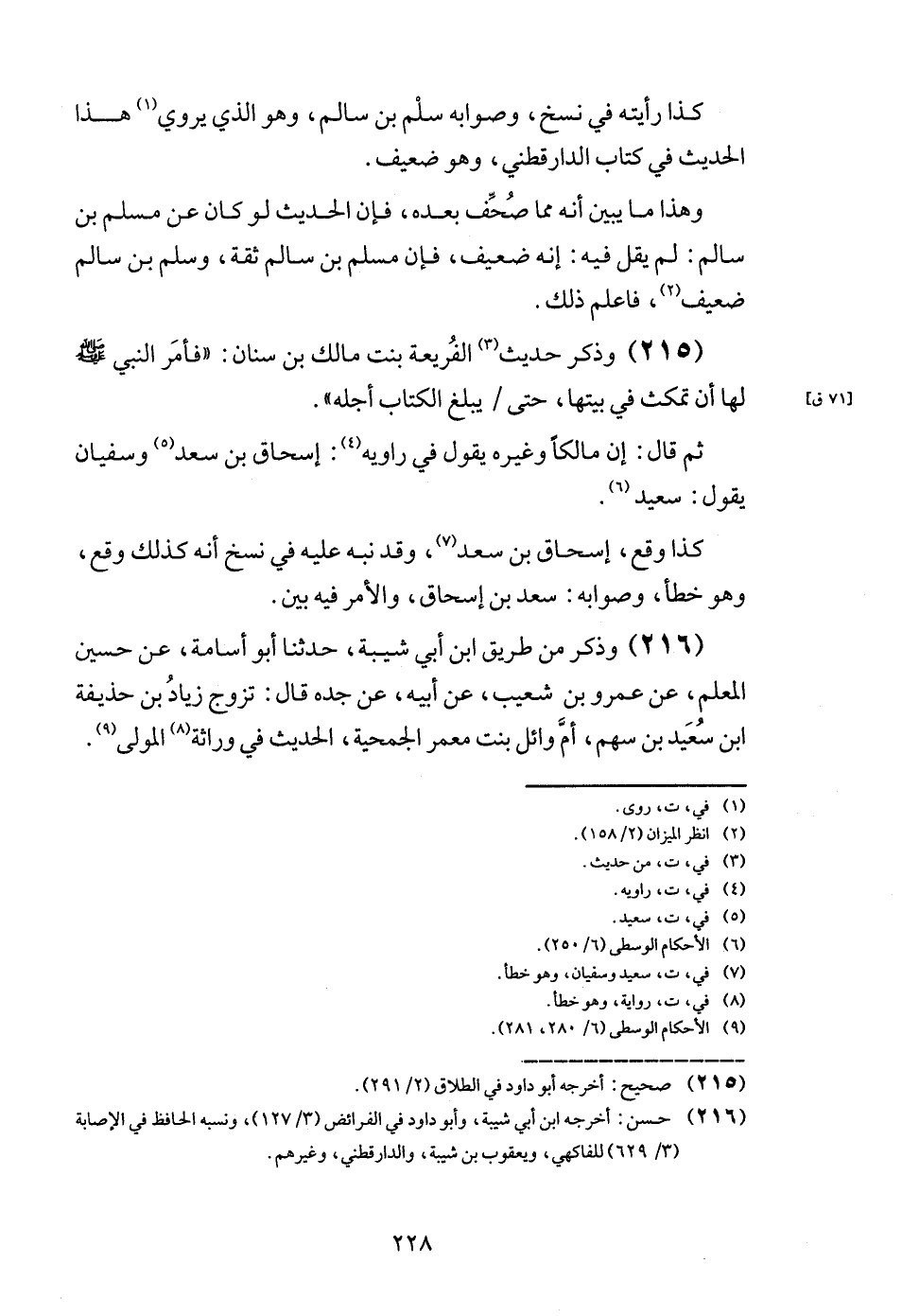 (215) وَذكر حَدِيث الفريعة بنت مَالك بن سِنَان: " فَأمر النَّبِي - صَلَّى اللَّهُ عَلَيْهِ وَسَلَّم َ - لَهَا أَن تمكث فِي بَيتهَا، حَتَّى / يبلغ الْكتاب أَجله ".