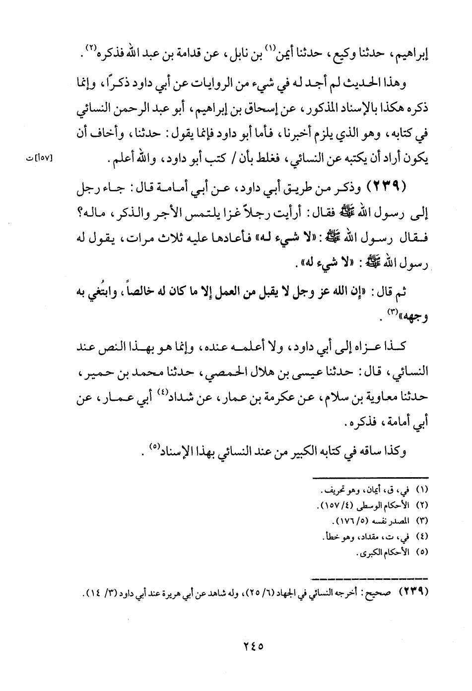 (239) وَذكر من طَرِيق أبي دَاوُد، عَن أبي أُمَامَة قَالَ: جَاءَ رجل إِلَى رَسُول الله - صَلَّى اللَّهُ عَلَيْهِ وَسَلَّم َ - فَقَالَ: أَرَأَيْت رجلا غزا يلْتَمس الْأجر وَالذكر، مَاله؟ فَقَالَ رَسُول الله - صَلَّى اللَّهُ عَلَيْهِ وَسَلَّم َ -: " لَا شَيْء لَهُ " فَأَعَادَهَا عَلَيْهِ ثَلَاث مَرَّات، يَقُول لَهُ رَسُول الله - صَلَّى اللَّهُ عَلَيْهِ وَسَلَّم َ -: " لَا شَيْء لَهُ ".