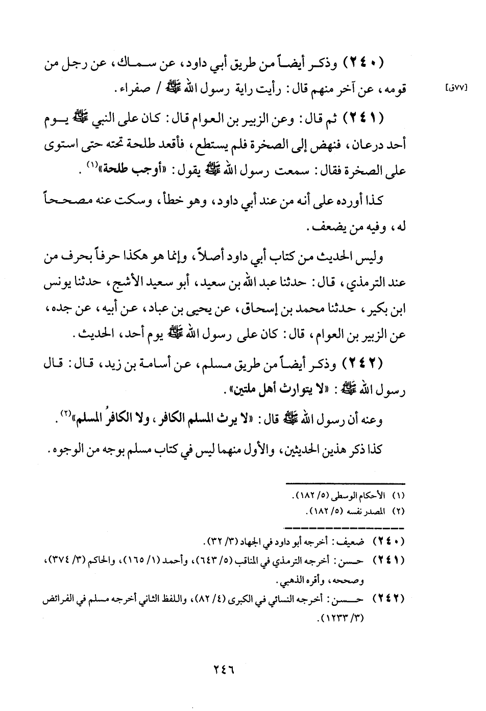 (241) ثمَّ قَالَ: وَعَن الزبير بن الْعَوام قَالَ: كَانَ على النَّبِي - صَلَّى اللَّهُ عَلَيْهِ وَسَلَّم َ - يَوْم أحد دِرْعَانِ، فَنَهَضَ إِلَى الصَّخْرَة فَلم يسْتَطع، فَأقْعدَ طَلْحَة تَحْتَهُ حَتَّى اسْتَوَى على الصَّخْرَة فَقَالَ: سَمِعت رَسُول الله - صَلَّى اللَّهُ عَلَيْهِ وَسَلَّم َ - يَقُول: " أوجب طَلْحَة ".