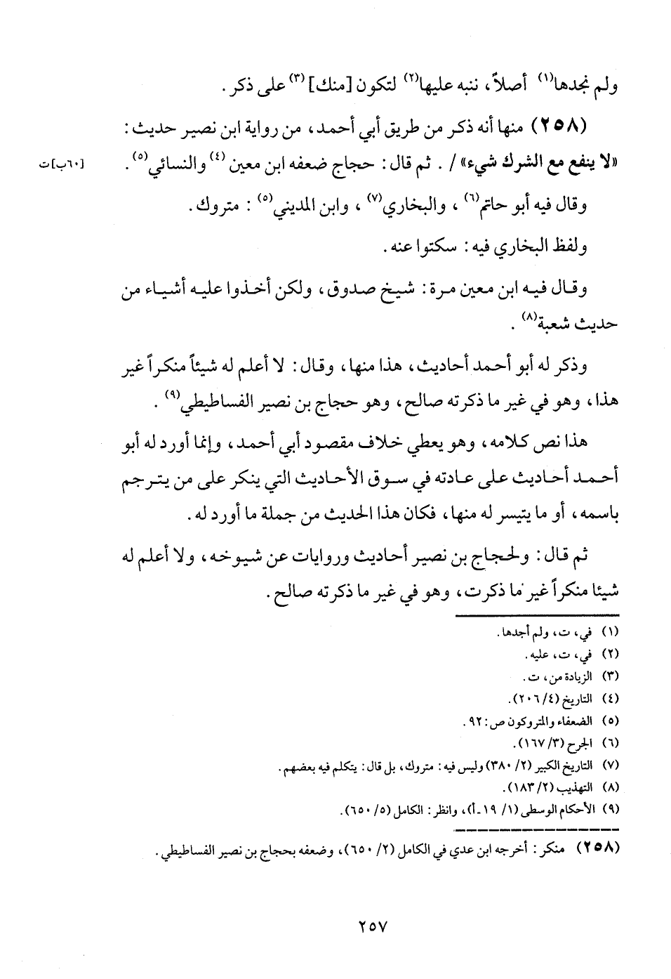 (258) مِنْهَا أَنه ذكر من طَرِيق أبي أَحْمد، من رِوَايَة ابْن نصير حَدِيث: " لَا ينفع مَعَ الشّرك شَيْء " /. ثمَّ قَالَ: حجاج ضعفه ابْن معِين وَالنَّسَائِيّ.