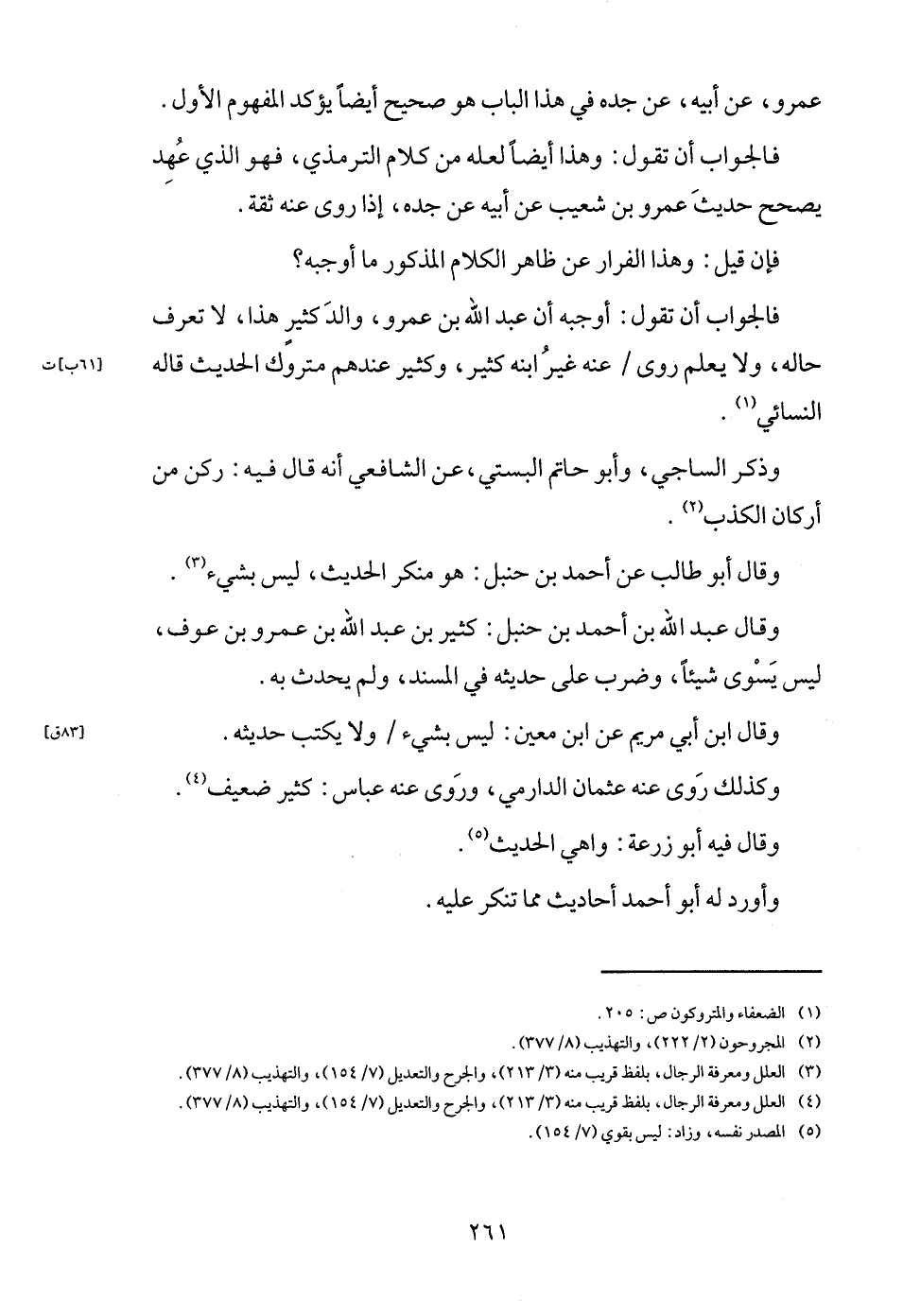 فَالْجَوَاب أَن تَقول: أوجبه أَن عبد الله بن عَمْرو، وَالِد كثير هَذَا، لَا تعرف حَاله، وَلَا يعلم روى / عَنهُ غير ابْنه كثير، وَكثير عِنْدهم مَتْرُوك الحَدِيث قَالَه النَّسَائِيّ.