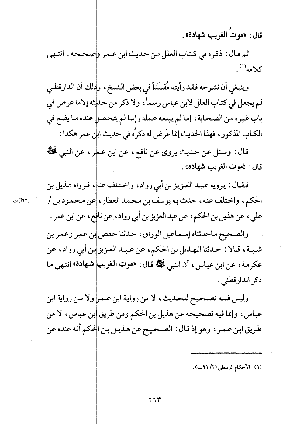 وَالصَّحِيح مَا حدّثنَاهُ إِسْمَاعِيل الْوراق، حَدثنَا حَفْص بن عمر وَعمر بن شبة، قَالَا: حَدثنَا الْهُذيْل بن الحكم، عَن عبد الْعَزِيز بن أبي رواد، عَن عِكْرِمَة عَن ابْن عَبَّاس، أَن النَّبِي - صَلَّى اللَّهُ عَلَيْهِ وَسَلَّم َ - قَالَ: " موت الْغَرِيب شَهَادَة " انْتهى مَا ذكر الدَّارَقُطْنِيّ.
