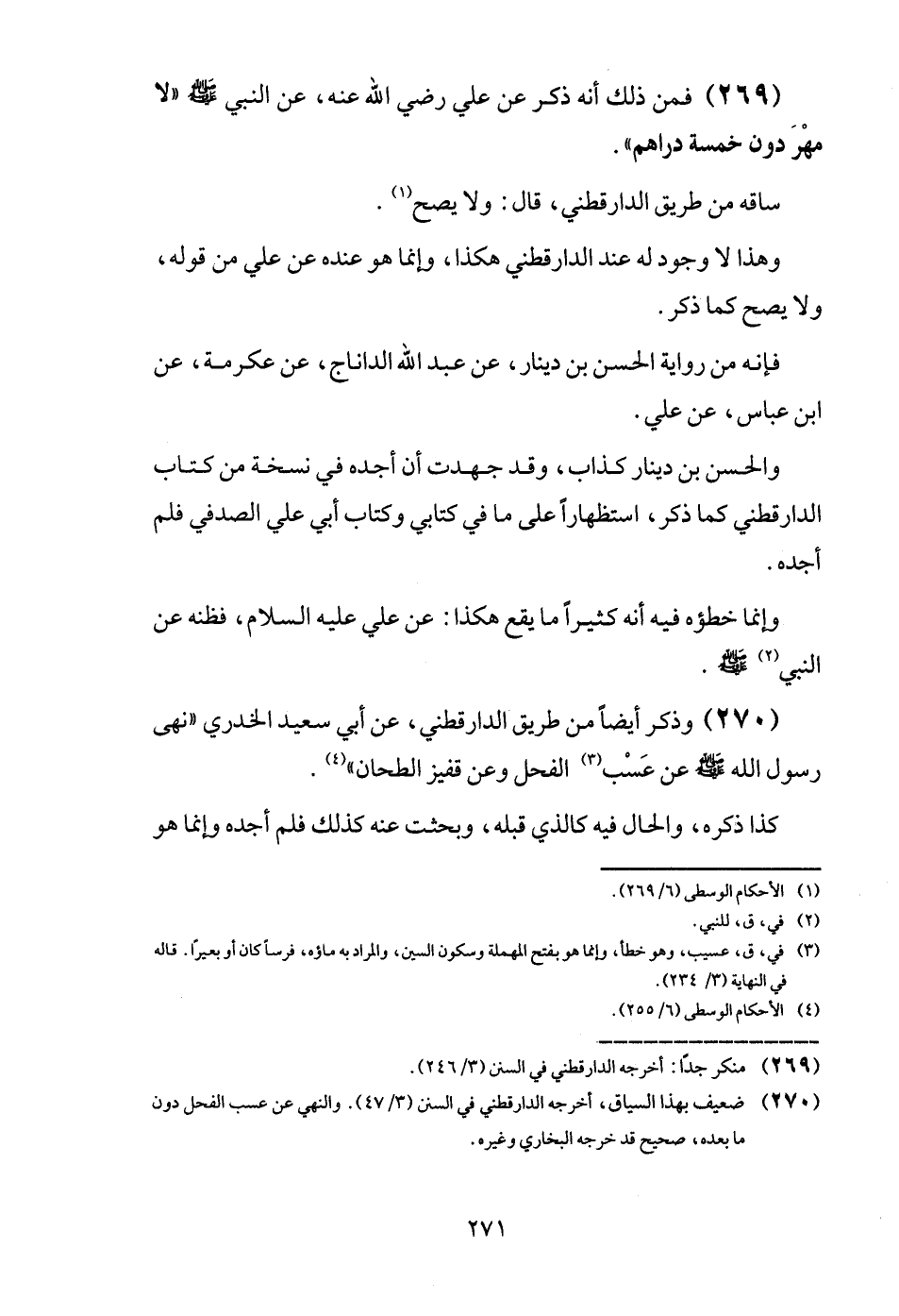 (269) فَمن ذَلِك أَنه ذكر عَن عَليّ رَضِي الله عَنهُ، عَن النَّبِي - صَلَّى اللَّهُ عَلَيْهِ وَسَلَّم َ - " لَا مهر دون خَمْسَة دَرَاهِم ".