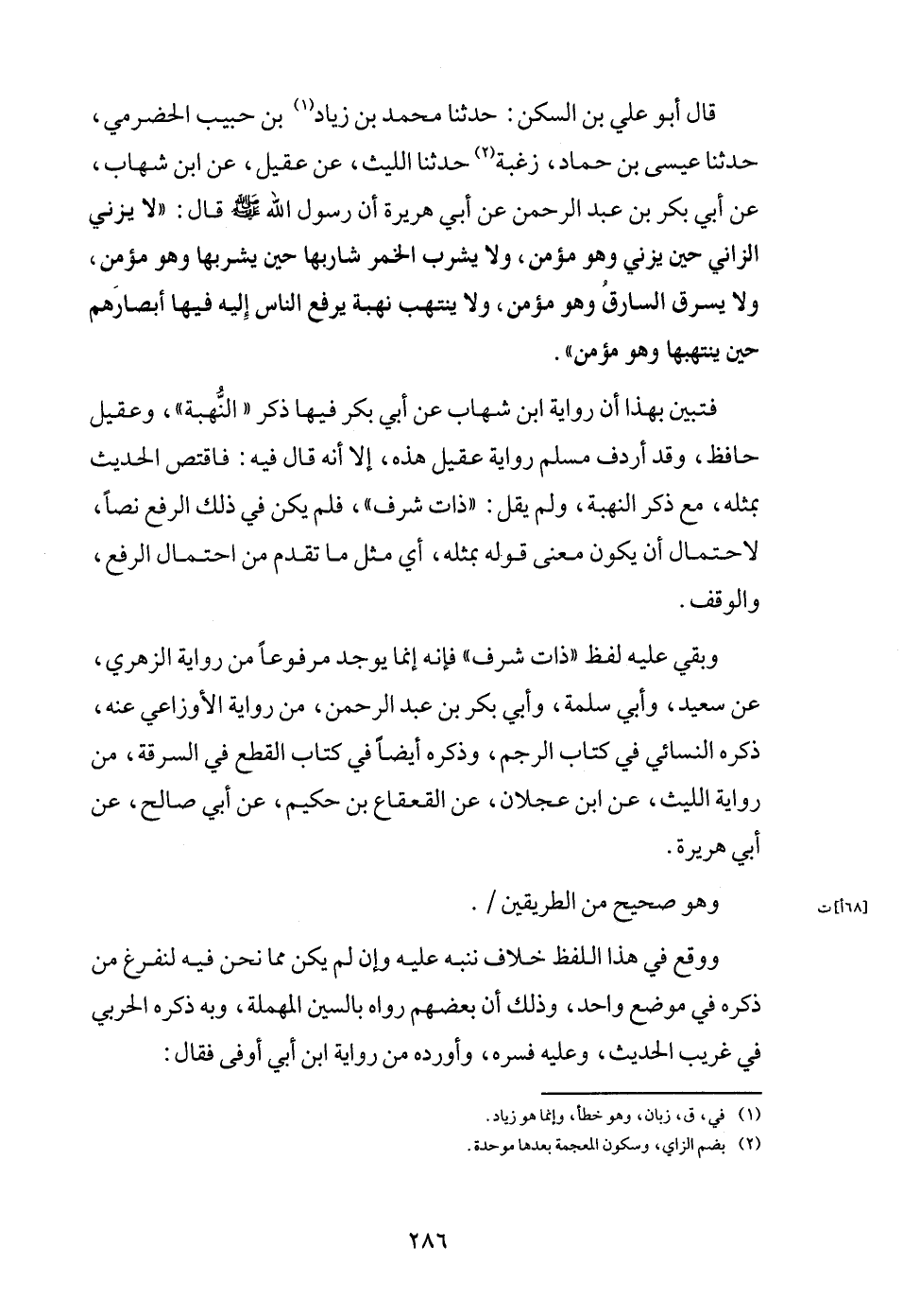قَالَ أَبُو عَليّ بن السكن: حَدثنَا مُحَمَّد بن زِيَاد بن حبيب الْحَضْرَمِيّ، حَدثنَا عِيسَى بن حَمَّاد، زغبة حَدثنَا اللَّيْث، عَن عقيل، عَن ابْن شهَاب، عَن أبي بكر بن عبد الرَّحْمَن عَن أبي هُرَيْرَة أَن رَسُول الله - صَلَّى اللَّهُ عَلَيْهِ وَسَلَّم َ - قَالَ: " لَا يَزْنِي الزَّانِي حِين يَزْنِي وَهُوَ مُؤمن، وَلَا يشرب الْخمر شاربها حِين يشْربهَا وَهُوَ مُؤمن، وَلَا يسرق السَّارِق وَهُوَ مُؤمن، وَلَا ينتهب نهبة يرفع النَّاس إِلَيْهِ فِيهَا أَبْصَارهم حِين ينتهبها وَهُوَ مُؤمن ".