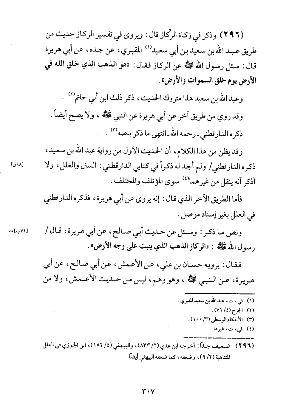 (296) وَذكر فِي زَكَاة الرِّكَاز قَالَ: ويروى فِي تَفْسِير الرِّكَاز حَدِيث من طَرِيق عبد الله بن سعيد بن أبي سعيد المَقْبُري، عَن جده، عَن أبي هُرَيْرَة قَالَ: سُئِلَ رَسُول الله - صَلَّى اللَّهُ عَلَيْهِ وَسَلَّم َ - عَن الرِّكَاز فَقَالَ: " هُوَ الذَّهَب الَّذِي خلق الله فِي الأَرْض يَوْم خلق السَّمَوَات وَالْأَرْض ".