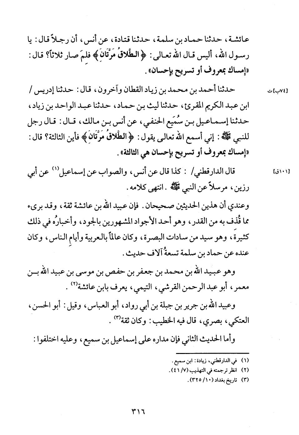 حَدثنَا أَحْمد بن مُحَمَّد بن زِيَاد الْقطَّان وَآخَرُونَ، قَالَ: حَدثنَا إِدْرِيس / ابْن عبد الْكَرِيم الْمُقْرِئ، حَدثنَا لَيْث بن حَمَّاد، حَدثنَا عبد الْوَاحِد بن زِيَاد، حَدثنَا إِسْمَاعِيل بن سميع الْحَنَفِيّ، عَن أنس بن مَالك، قَالَ: قَالَ رجل للنَّبِي - صَلَّى اللَّهُ عَلَيْهِ وَسَلَّم َ -: إِنِّي أسمع الله تَعَالَى يَقُول: {الطَّلَاق مَرَّتَانِ} فَأَيْنَ الثَّالِثَة؟ قَالَ: " إمْسَاك بِمَعْرُوف أَو تَسْرِيح بِإِحْسَان هِيَ الثَّالِثَة ".