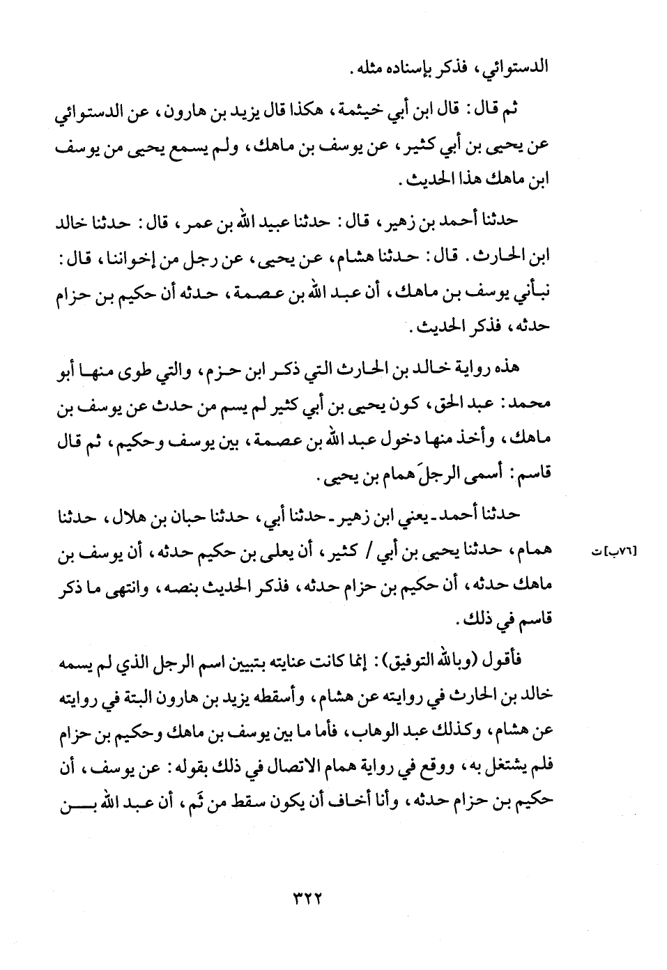 هَذِه رِوَايَة خَالِد بن الْحَارِث الَّتِي ذكر ابْن حزم، وَالَّتِي طوى مِنْهَا أَبُو مُحَمَّد: عبد الْحق، كَون يحيى بن أبي كثير لم يسم من حدث عَن يُوسُف بن مَاهك، وَأخذ مِنْهَا دُخُول عبد الله بن عصمَة، بَين يُوسُف وَحَكِيم، ثمَّ قَالَ قَاسم: أسمى الرجل همام بن يحيى.