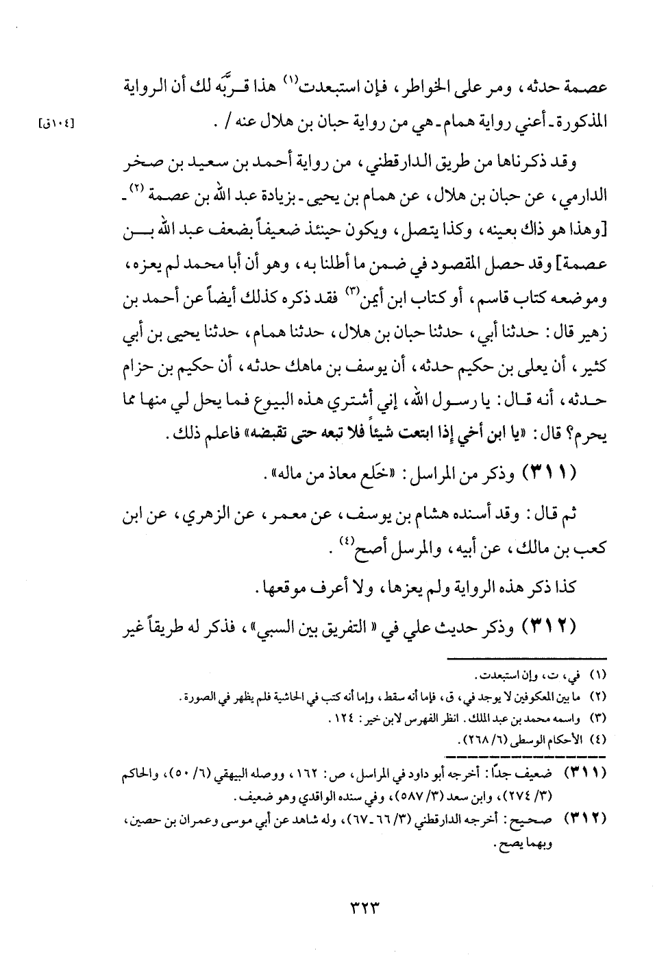 وَقد ذَكرنَاهَا من طَرِيق الدَّارَقُطْنِيّ، من رِوَايَة أَحْمد بن سعيد بن صَخْر الدَّارمِيّ، عَن حبَان بن هِلَال، عَن همام بن يحيى - بِزِيَادَة عبد الله بن عصمَة -[وَهَذَا هُوَ ذَاك بِعَيْنِه، وَكَذَا يتَّصل، وَيكون حِينَئِذٍ ضَعِيفا بِضعْف عبد الله بن عصمَة] وَقد حصل الْمَقْصُود فِي ضمن مَا أطلنا بِهِ، وَهُوَ أَن أَبَا مُحَمَّد لم يعزه، وموضعه كتاب قَاسم، أَو كتاب ابْن أَيمن فقد ذكره كَذَلِك أَيْضا عَن أَحْمد بن زُهَيْر قَالَ: حَدثنَا أبي، حَدثنَا حبَان بن هِلَال، حَدثنَا همام، حَدثنَا يحيى بن أبي كثير، أَن يعلى بن حَكِيم حَدثهُ، أَن يُوسُف بن مَاهك حَدثهُ، أَن حَكِيم بن حزَام حَدثهُ، أَنه قَالَ: يَا رَسُول الله، إِنِّي أَشْتَرِي هَذِه الْبيُوع فَمَا يحل لي مِنْهَا مِمَّا يحرم؟ قَالَ: " يَا ابْن أخي إِذا ابتعت شَيْئا فَلَا تبعه حَتَّى تقبضه " فَاعْلَم ذَلِك.