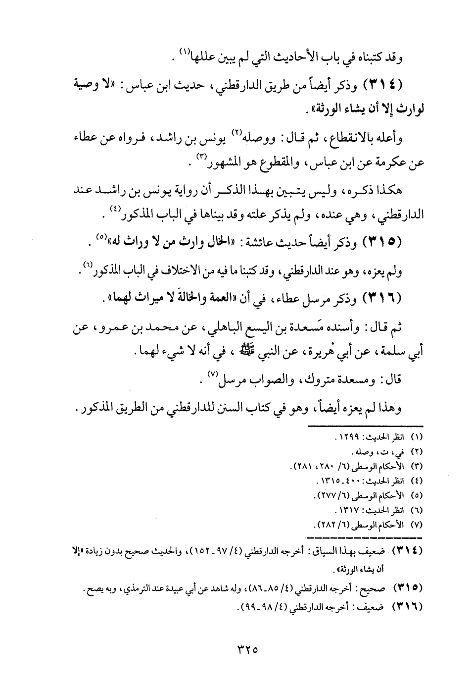 (314) وَذكر أَيْضا من طَرِيق الدَّارَقُطْنِيّ، حَدِيث ابْن عَبَّاس: " لَا وَصِيَّة لوَارث إِلَّا أَن يَشَاء الْوَرَثَة ".