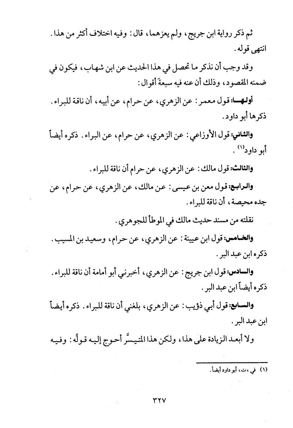 أَولهَا: قَول معمر: عَن الزُّهْرِيّ، عَن حرَام، عَن أَبِيه، أَن نَاقَة للبراء. ذكرهَا أَبُو دَاوُد.