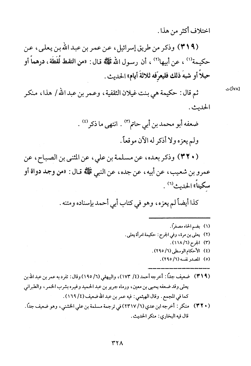 (319) وَذكر من طَرِيق إِسْرَائِيل، عَن عمر بن عبد الله بن يعلى، عَن حكيمة، عَن أَبِيهَا، أَن رَسُول الله - صَلَّى اللَّهُ عَلَيْهِ وَسَلَّم َ - قَالَ: " من الْتقط لقطَة، درهما أَو حبلاً أَو شبه ذَلِك فليعرفه ثَلَاثَة أَيَّام " الحَدِيث.