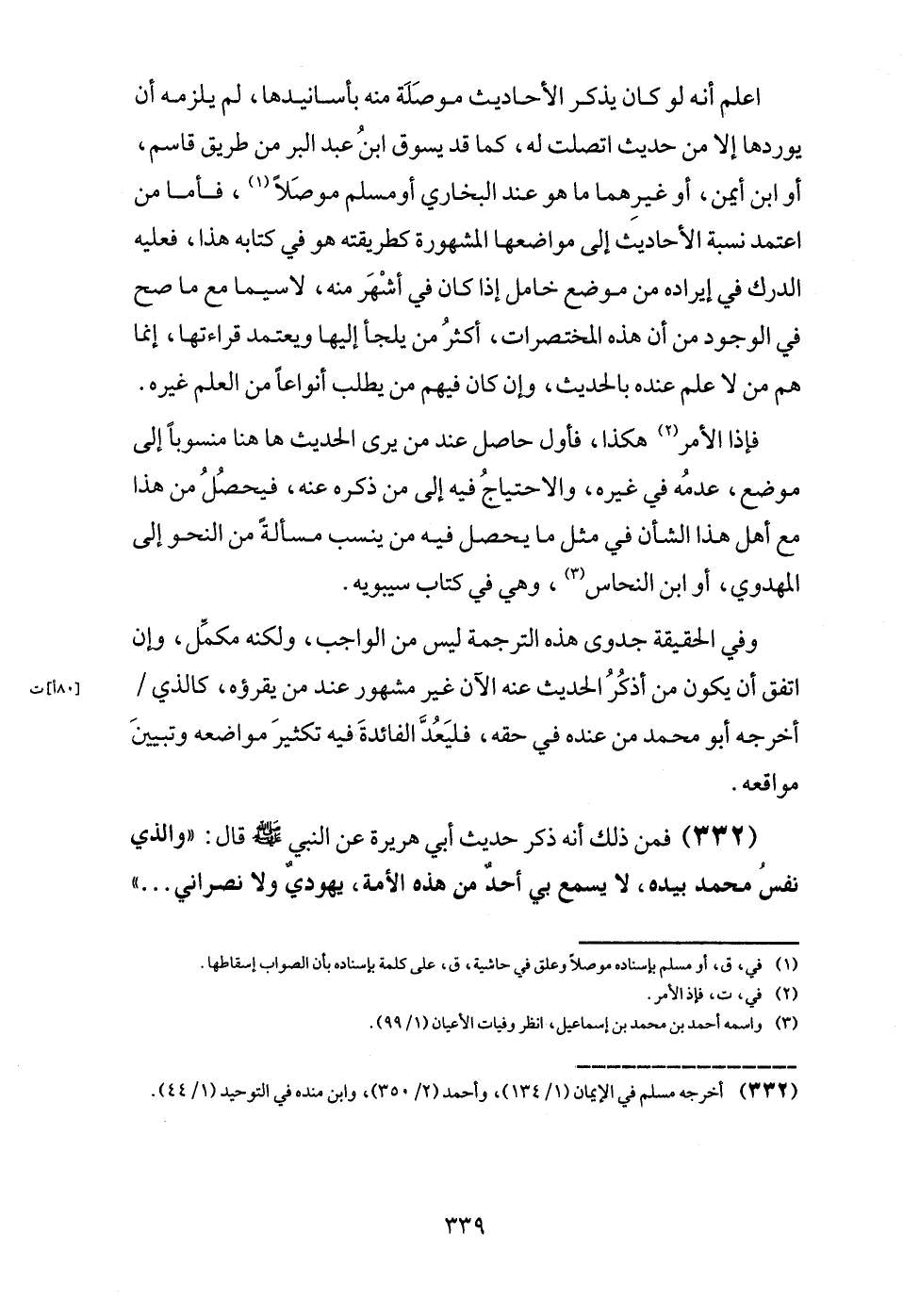 (332) فَمن ذَلِك أَنه ذكر حَدِيث أبي هُرَيْرَة عَن النَّبِي - صَلَّى اللَّهُ عَلَيْهِ وَسَلَّم َ - قَالَ: " وَالَّذِي نفس مُحَمَّد بِيَدِهِ، وَلَا يسمع بِي اُحْدُ من هَذِه الْأمة، يَهُودِيّ وَلَا نَصْرَانِيّ ... "