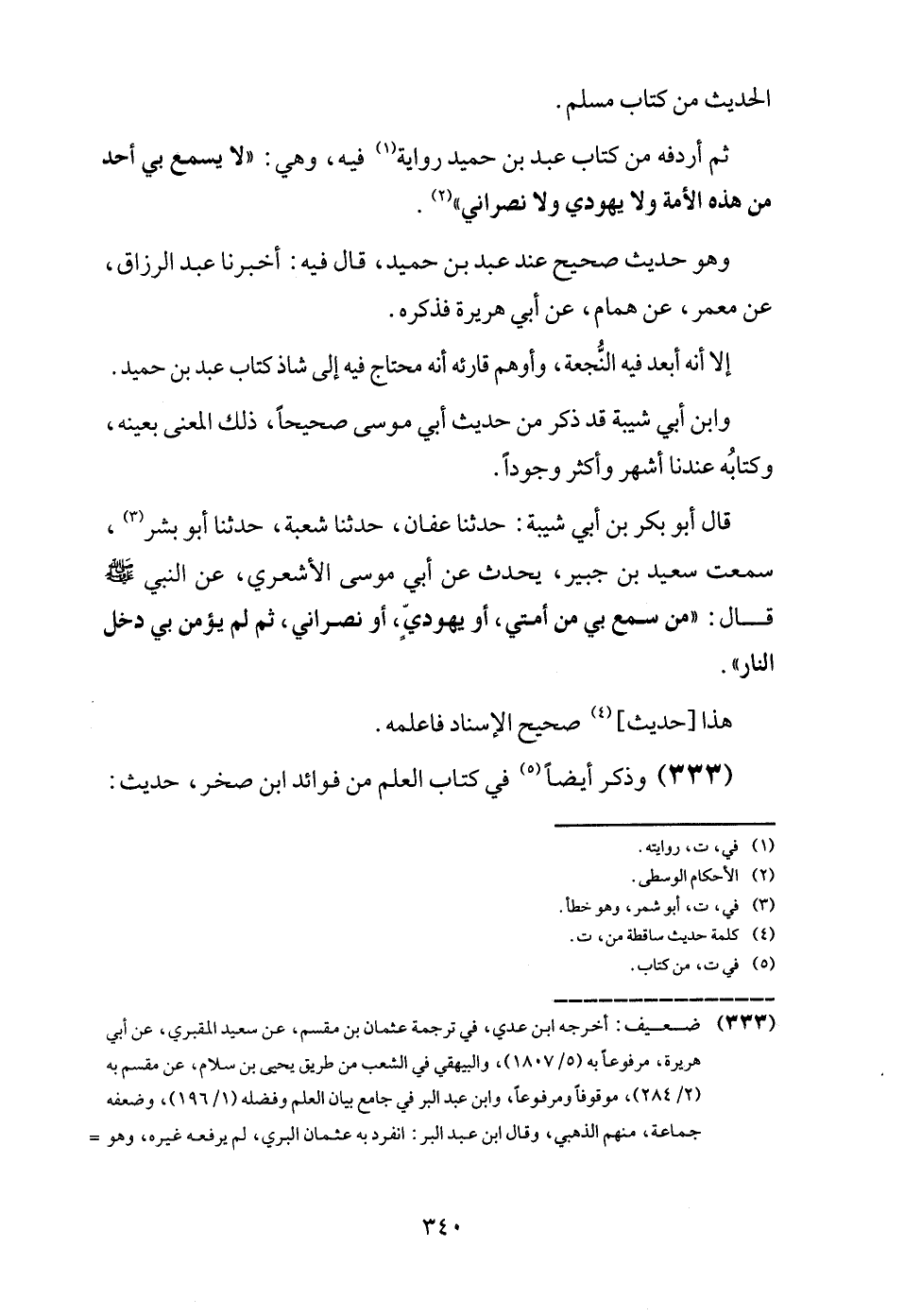 ثمَّ أردفه من كتاب عبد بن حميد رِوَايَة فِيهِ، وَهِي: " لَا يسمع بِي أحد من هَذِه الْأمة وَلَا يَهُودِيّ وَلَا نَصْرَانِيّ ".