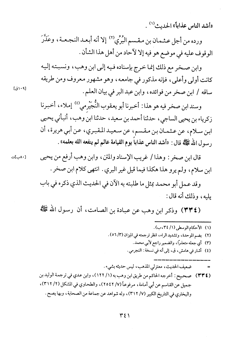 وَسَنَد ابْن صَخْر فِيهِ هُوَ هَذَا: أخبرنَا أَبُو يَعْقُوب النجيرمي إملاء، أخبرنَا زَكَرِيَّاء بن يحيى السَّاجِي، حَدثنَا أَحْمد بن سعيد، حَدثنَا ابْن وهب، أنبأني يحيى ابْن سَلام، عَن عُثْمَان بن مقسم، عَن سعيد المَقْبُري، عَن أبي هُرَيْرَة، أَن رَسُول الله - صَلَّى اللَّهُ عَلَيْهِ وَسَلَّم َ - قَالَ: " أَشد النَّاس عذَابا يَوْم الْقِيَامَة عَالم لم يَنْفَعهُ الله بِعِلْمِهِ ". قَالَ ابْن صَخْر: وَهَذَا / غَرِيب الْإِسْنَاد والمتن، وَابْن وهب أرفع من يحيى ابْن سَلام، وَلم يرو هَذَا هَكَذَا فِيمَا قيل غير الْبري. انْتهى كَلَام ابْن صَخْر.