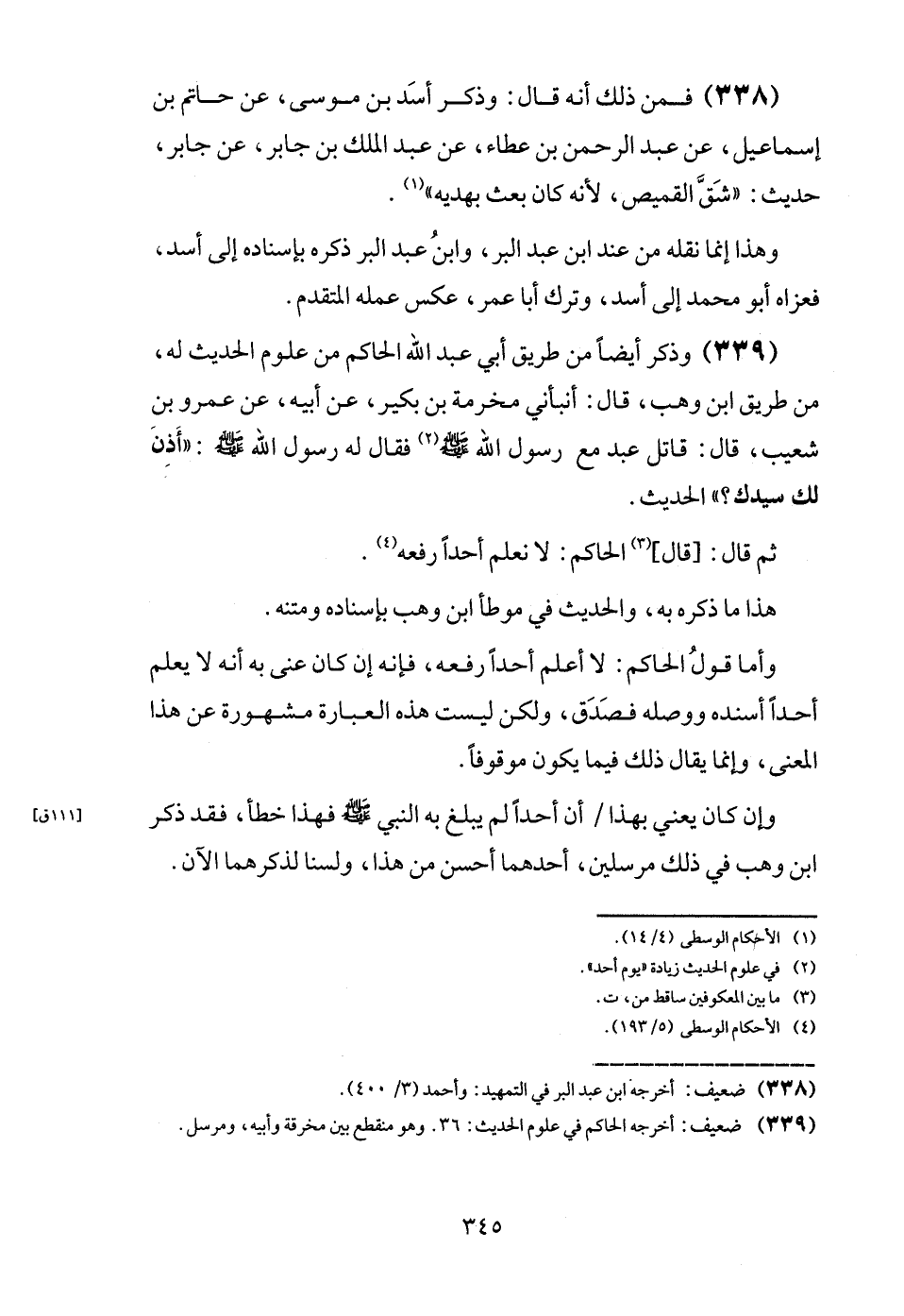 (338) فَمن ذَلِك أَنه قَالَ: وَذكر أَسد بن مُوسَى، عَن حَاتِم بن إِسْمَاعِيل، عَن عبد الرَّحْمَن بن عَطاء، عَن عبد الْملك بن جَابر، عَن جَابر، حَدِيث: " شقّ الْقَمِيص، لِأَنَّهُ كَانَ بعث بهديه ".