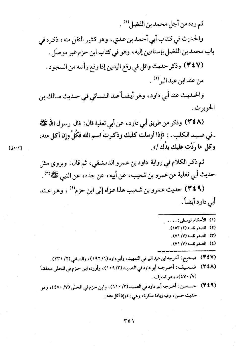 (348) وَذكر من طَرِيق أبي دَاوُد، عَن أبي ثَعْلَبَة قَالَ: قَالَ رَسُول الله - صَلَّى اللَّهُ عَلَيْهِ وَسَلَّم َ - فِي صيد الْكَلْب -: " إِذا أرْسلت كلبك وَذكرت اسْم الله فَكل وَإِن أكل مِنْهُ، وكل مَا ردَّتْ عَلَيْك يدك / ".