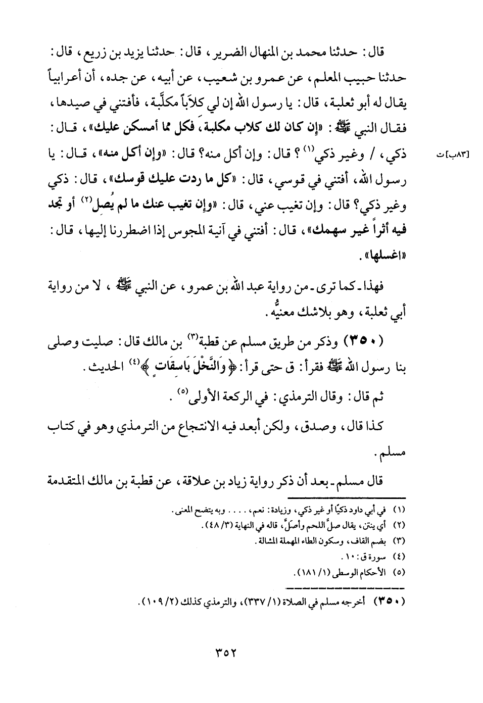 قَالَ: حَدثنَا مُحَمَّد بن الْمنْهَال الضَّرِير، قَالَ: حَدثنَا يزِيد بن زُرَيْع، قَالَ: حَدثنَا حبيب الْمعلم، عَن عَمْرو بن شُعَيْب، عَن أَبِيه، عَن جده، أَن أَعْرَابِيًا يُقَال لَهُ أَبُو ثَعْلَبَة، قَالَ: يَا رَسُول الله إِن لي كلاباً مكلبة، فأفتني فِي صيدها، فَقَالَ النَّبِي - صَلَّى اللَّهُ عَلَيْهِ وَسَلَّم َ -: " إِن كَانَ لَك كلاب مكلبة، فَكل مِمَّا أمسكن عَلَيْك "، قَالَ: ذكي، / وَغير ذكي؟ قَالَ وَإِن أكل مِنْهُ؟ قَالَ: " وَإِن أكل مِنْهُ "، قَالَ: يَا رَسُول الله، أَفْتِنِي فِي قوسي، قَالَ: " كل مَا ردَّتْ عَلَيْك قوسك "، قَالَ: ذكي وَغير ذكي؟ قَالَ: وَإِن تغيب عني، قَالَ: " وَإِن تغيب عَنْك مَا لم يصل أَو تَجِد فِيهِ أثرا غير سهمك "، قَالَ: أَفْتِنِي فِي آنِية الْمَجُوس إِذا اضطررنا إِلَيْهَا، قَالَ: " اغسلها ".