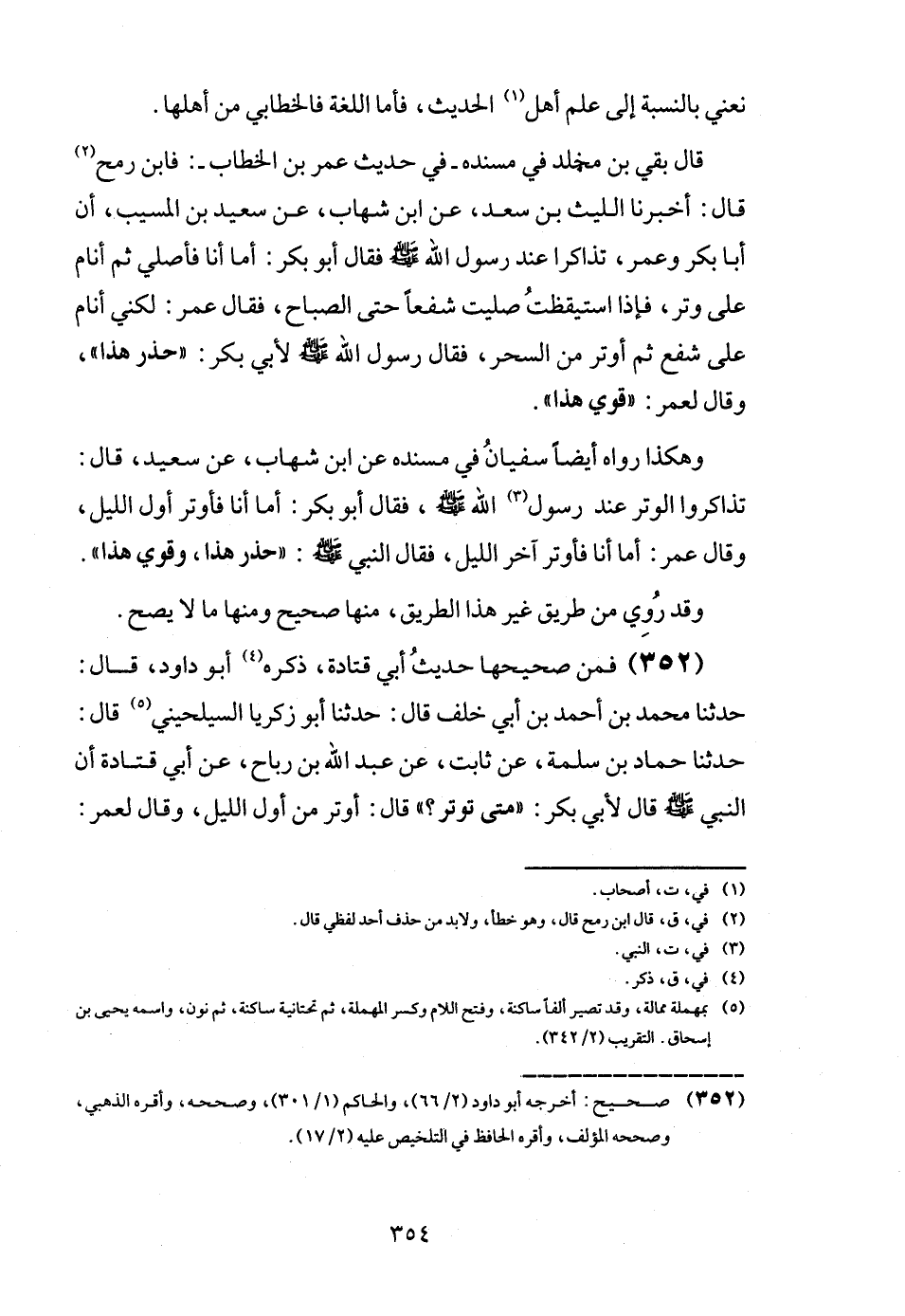 قَالَ بَقِي بن مخلد فِي مُسْنده فِي حَدِيث عمر بن الْخطاب -: فَابْن رمح قَالَ: أخبرنَا اللَّيْث بن سعد، عَن ابْن شهَاب، عَن سعيد بن الْمسيب، أَن أَبَا بكر وَعمر، تذاكرا عِنْد رَسُول الله - صَلَّى اللَّهُ عَلَيْهِ وَسَلَّم َ - فَقَالَ أَبُو بكر: أما أَنا فأصلي ثمَّ أَنَام على وتر، فَإِذا استيقظت صليت شفعاً حَتَّى الصَّباح، فَقَالَ عمر: لكني أَنَام على شفع ثمَّ أوتر من السحر، فَقَالَ رَسُول الله - صَلَّى اللَّهُ عَلَيْهِ وَسَلَّم َ - لأبي بكر: " حذر هَذَا " وَقَالَ لعمر: " قوي هَذَا ".