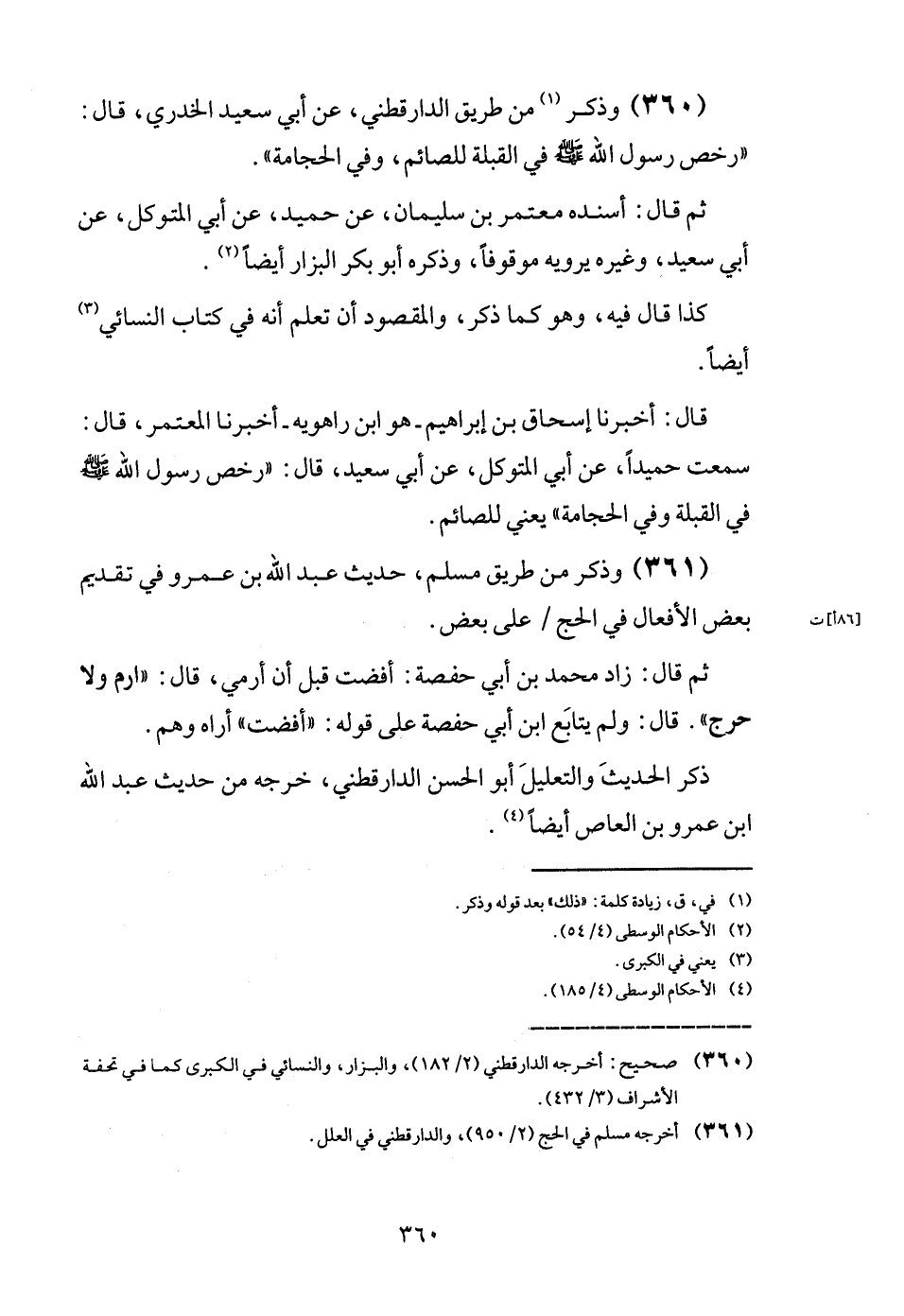 (360) وَذكر من طَرِيق الدَّارَقُطْنِيّ، عَن أبي سعيد الْخُدْرِيّ، قَالَ: " رخص رَسُول الله - صَلَّى اللَّهُ عَلَيْهِ وَسَلَّم َ - فِي الْقبْلَة للصَّائِم، وَفِي الْحجامَة ".